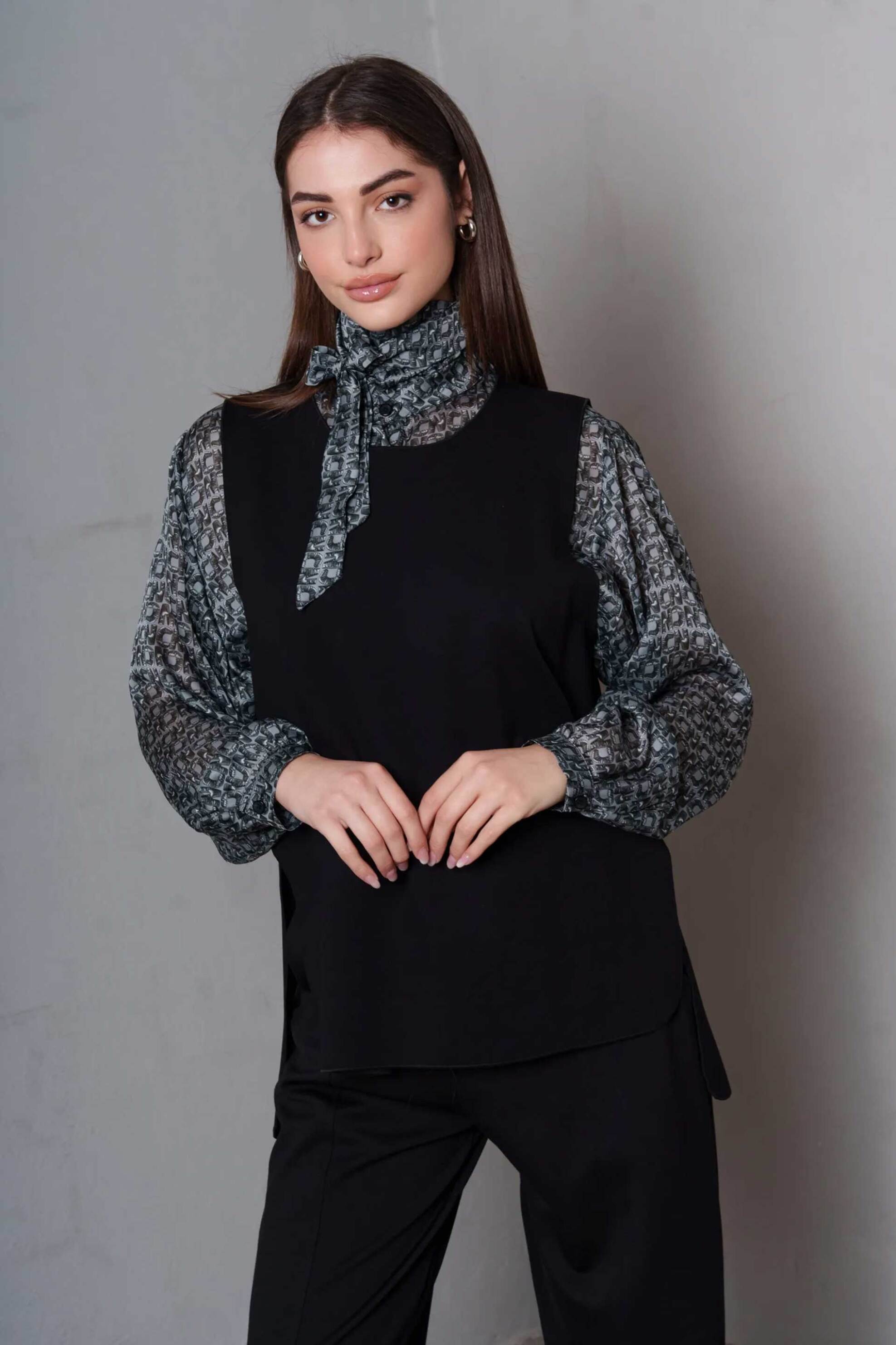 Γυναικείο γιλέκο. Στρογγυλή λαιμόκοψη. Ασύμμετρο. Κανονική γραμμή. Προέλευση: GR. 65% rayon, 30% nylon, 5% elastane Το μοντέλο φοράει νούμερο S. ΠΑΝΤΑΖΟΠΟΥΛΟΣ Μ.& ΣΙΑ Ε.Ε.