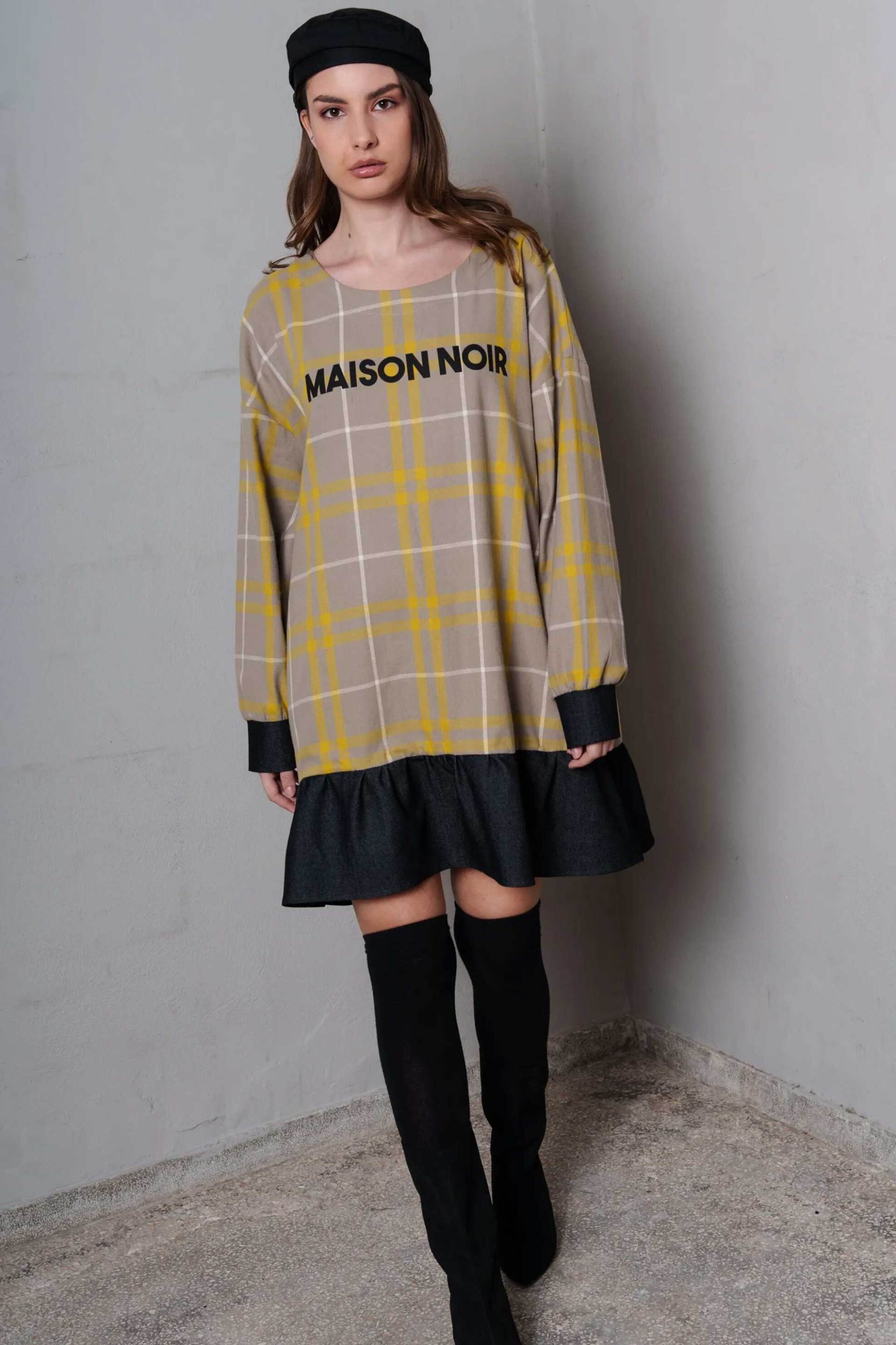 Γυναικείο φόρεμα mini. Στρογγυλή λαιμόκοψη. Μακρύ μανίκι. Maison Noir vinyl λογότυπο. Βολάν στο κάτω μέρος. Καρό σχέδιο. Προέλευση: GR. 100% βαμβάκι Το μοντέλο φοράει νούμερο S/Μ. ΠΑΝΤΑΖΟΠΟΥΛΟΣ Μ.& ΣΙΑ Ε.Ε.