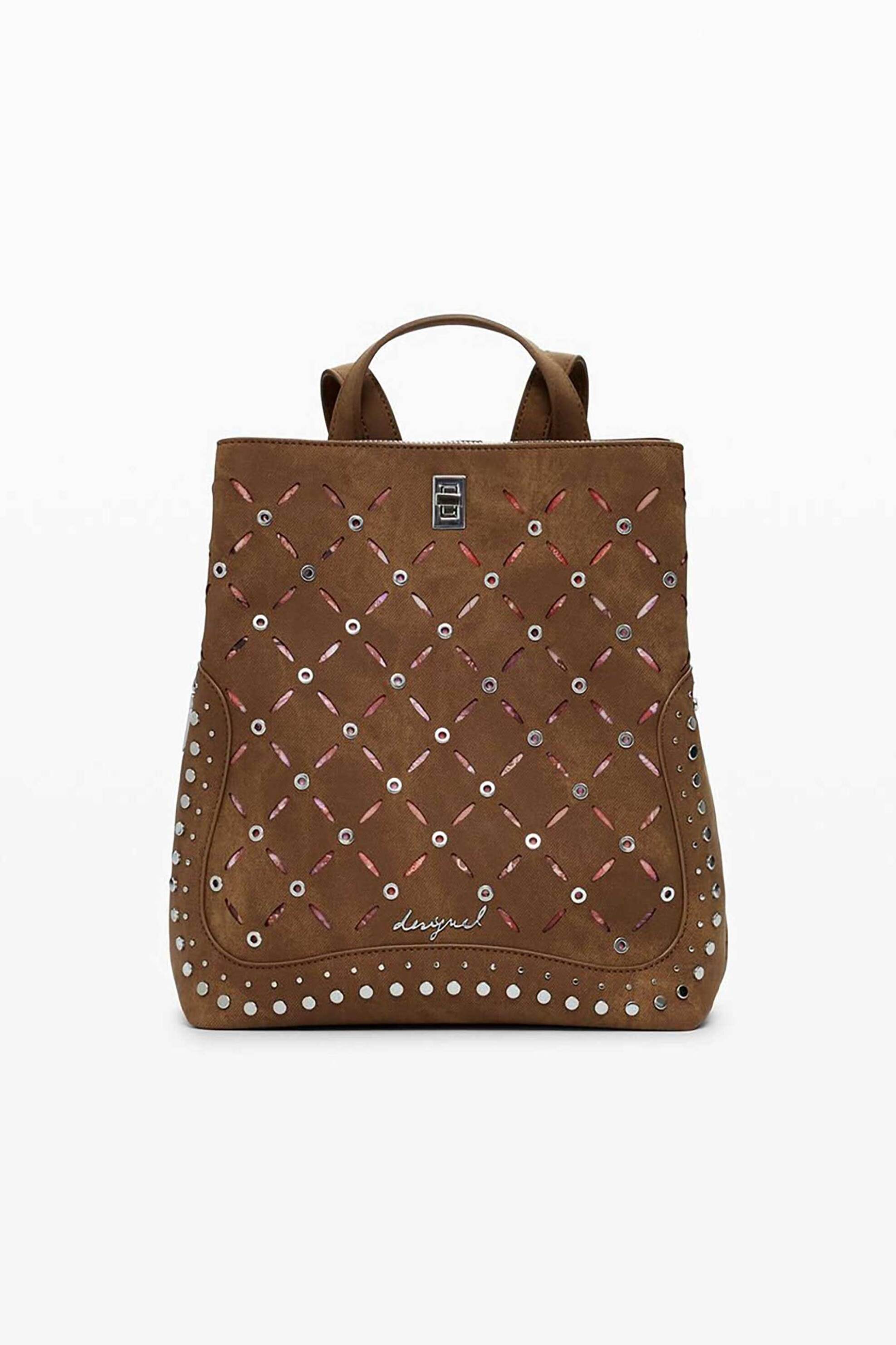 Γυναικεία τσάντα χειρός/backpack. Διάτρητο σχέδιο και τρουκς. Kλείσιμο με φερμουάρ. Πολλαπλά εσωτερικά διαμερίσματα. Αφαιρούμενη λαβή χειρός. Χωρητικότητα: 6,15 lt. Διαστάσεις: 24 x 9 x 30,60 cm. Προέλευση: Κίνα. 100% polyurethane SHOP & TRADE AEBE