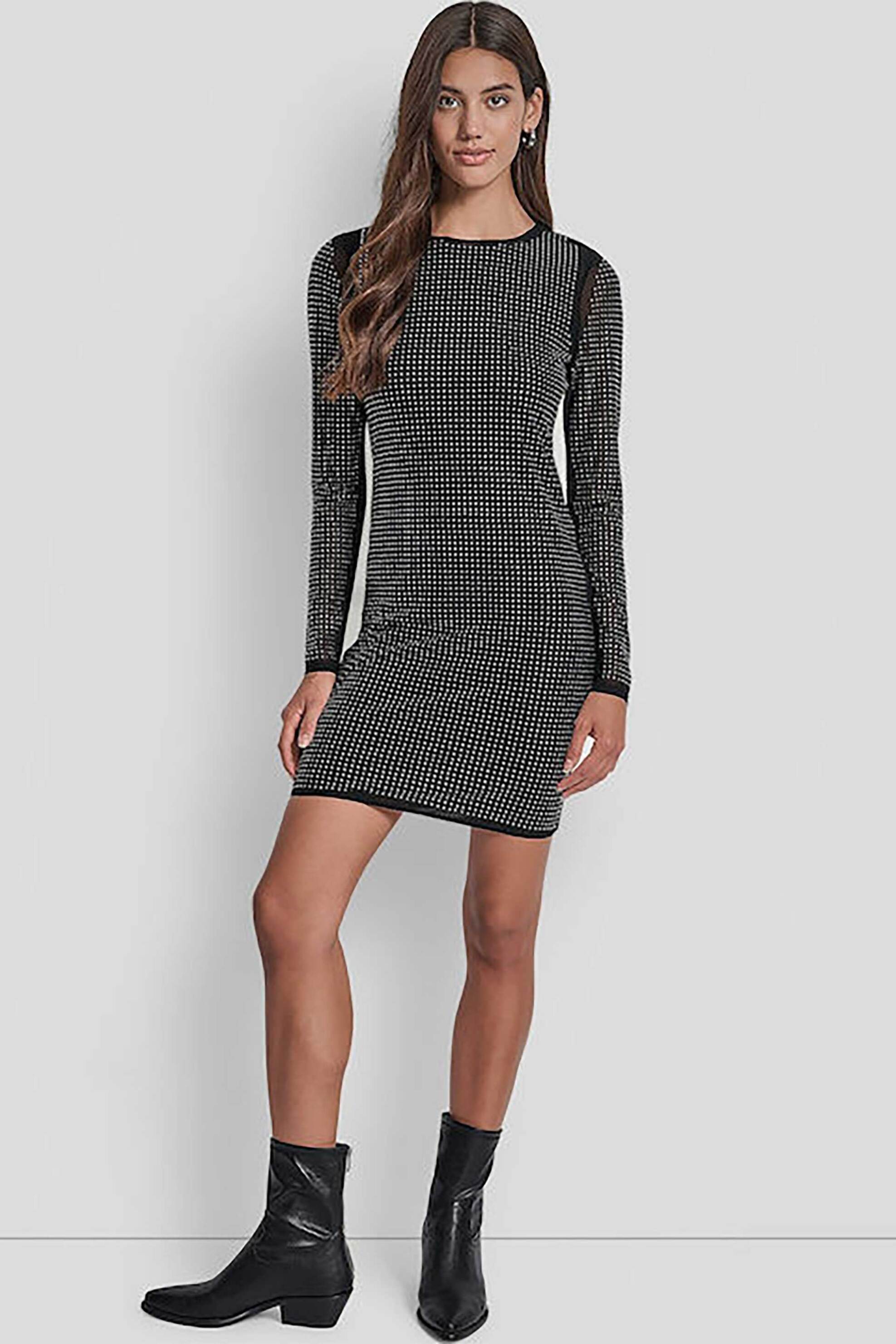 Γυναικείο mini φόρεμα. Μονόχρωμο. Στρας. Μεταλλικό λογότυπο στο πίσω μέρος. Μακρύ μανίκι. Slim fit. Προέλευση: Βιετνάμ. 95% polyester, 5% spandex UNLIMITED SPORT Α.Ε.
