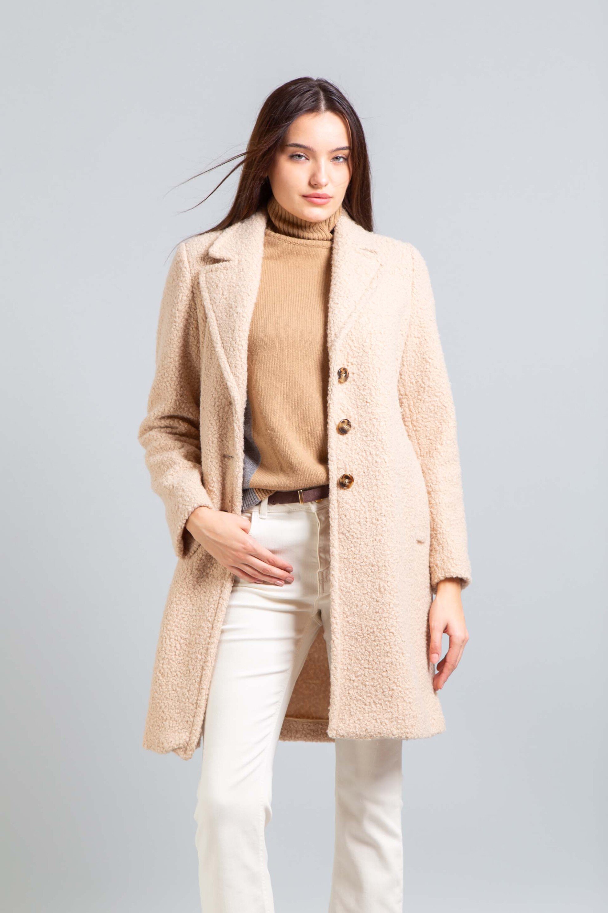 Γυναικείο παλτό μπουκλέ. Γιακάς. Κλείσιμο με κουμπιά. Τσέπες στο πλάι. Μακρύ μανίκι. Προέλευση: MA. 100% polyester DEDIMAX SRL
