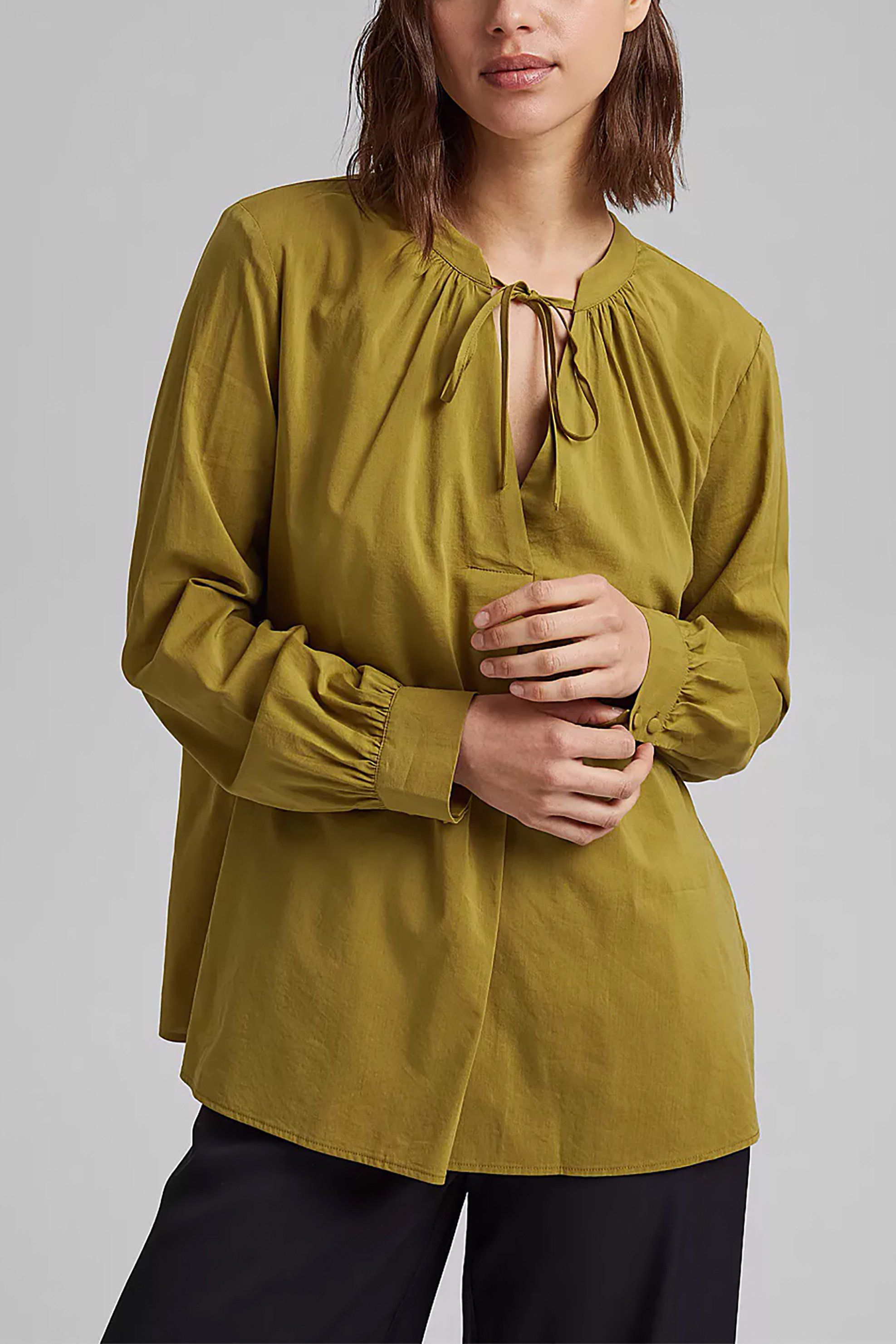Γυναικεία μπλούζα. Μονόχρωμη. Στρογγυλή λαιμόκοψη με V άνοιγμα. Δέσιμο στη λαιμόκοψη. Μακρύ μανίκι με διπλό κουμπί στο τελείωμα. Σχέδιο με διακοσμητικές σούρες. 55% βαμβάκι, 45% βισκόζη