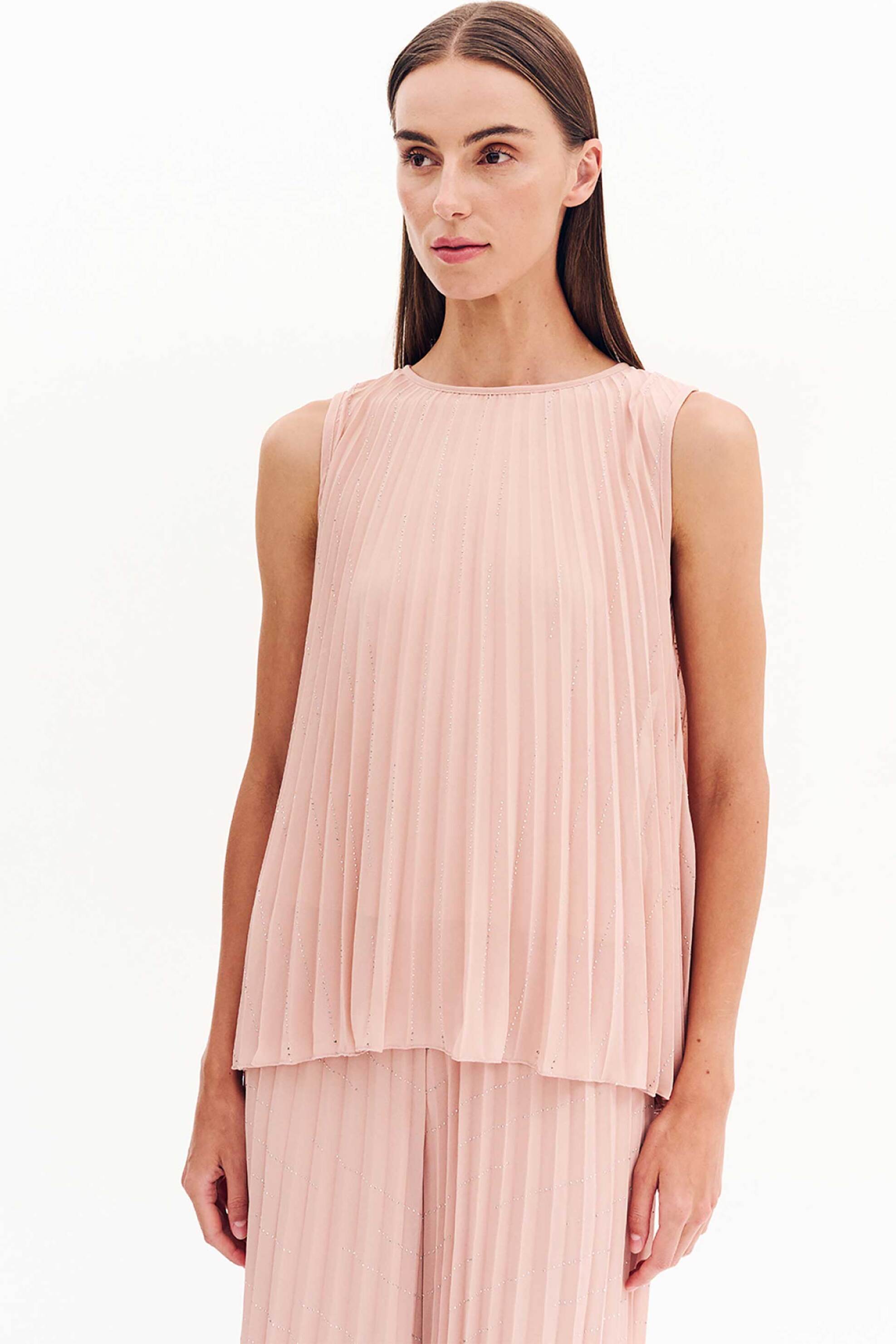 Γυναικεία μπλούζα. Aμάνικη. Πλισέ σχέδιο και στρας. Στρογγυλή λαιμόκοψη. Κλείσιμο με κουμπί. Προέλευση: EU. 100% polyester FOREL Α.Ε.