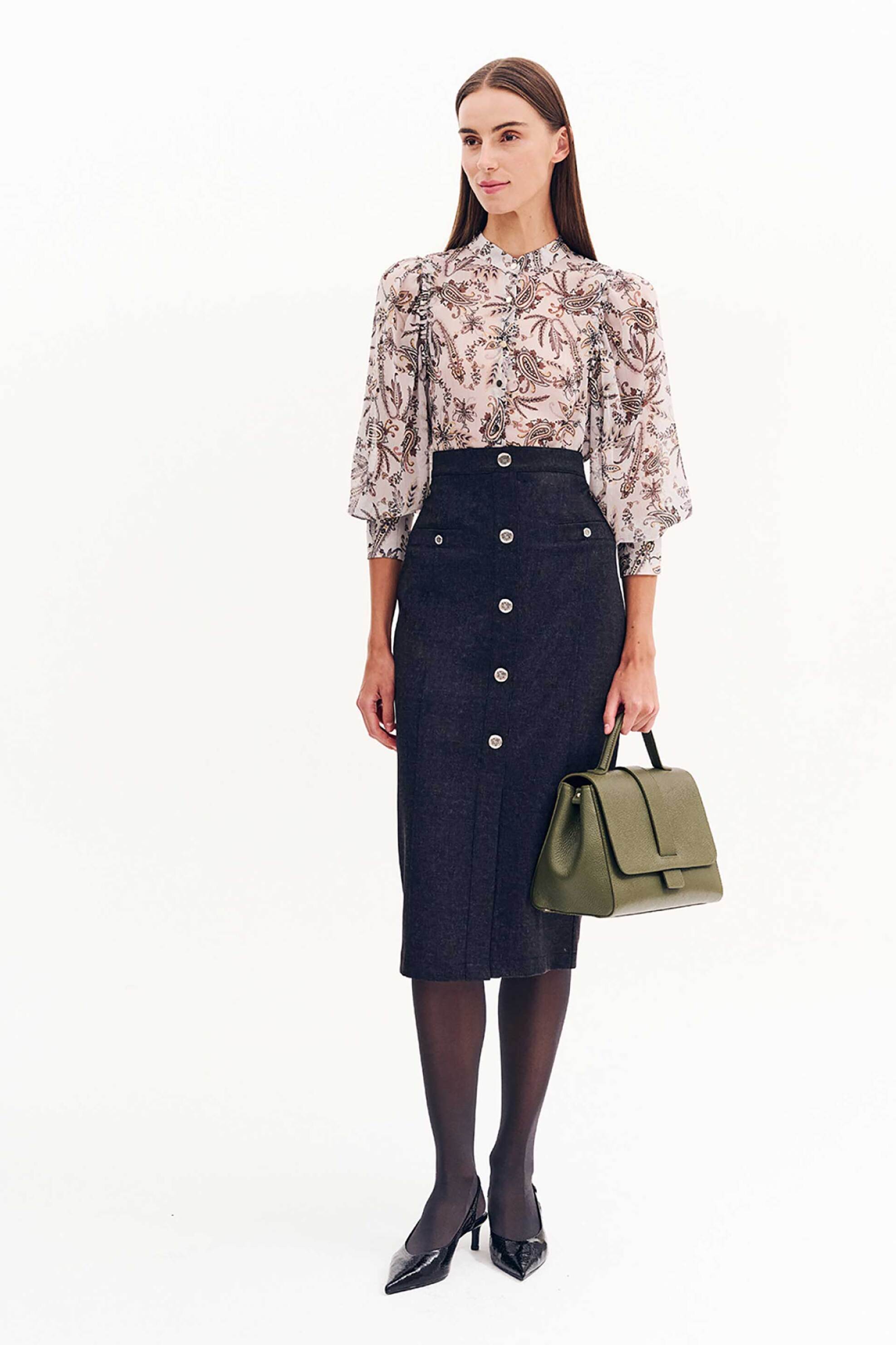 Γυναικεία midi φούστα. Μονόχρωμη. Ψηλόμεση. Pencil. Διακοσμητικά κουμπιά. Κλείσιμο στο πίσω μέρος με φερμουάρ. Προέλευση: EU. 60% polyester, 35% βισκόζη, 5% elastane FOREL Α.Ε.