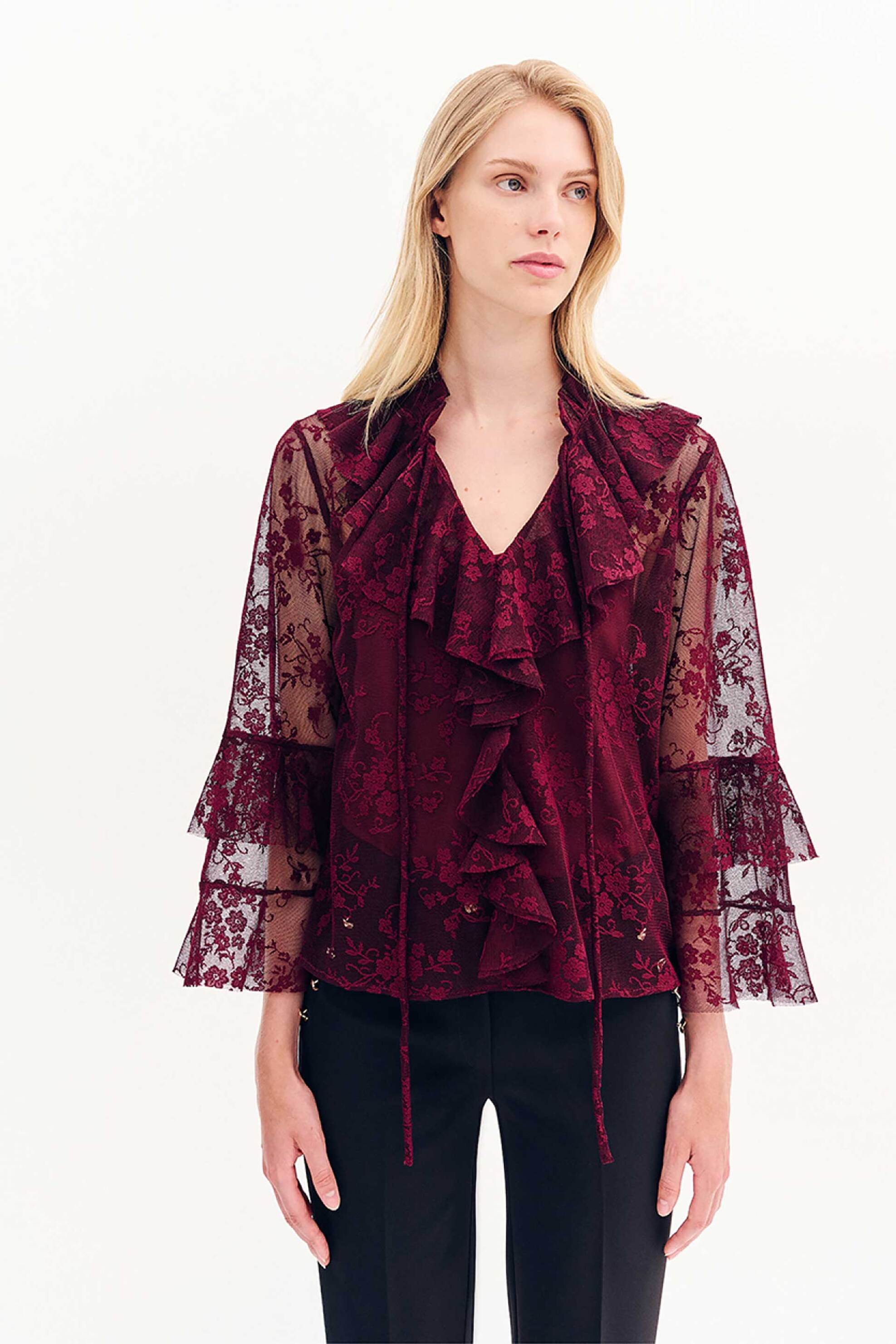 Γυναικεία μπλούζα. Μονόχρωμη. All-over διάτρητο σχέδιο με δαντέλα. Βολάν στο μπροστινό μέρος. V λαιμόκοψη με κορδόνι. Mακρύ μανίκι. Προέλευση: EU. 100% polyurethane FOREL Α.Ε.