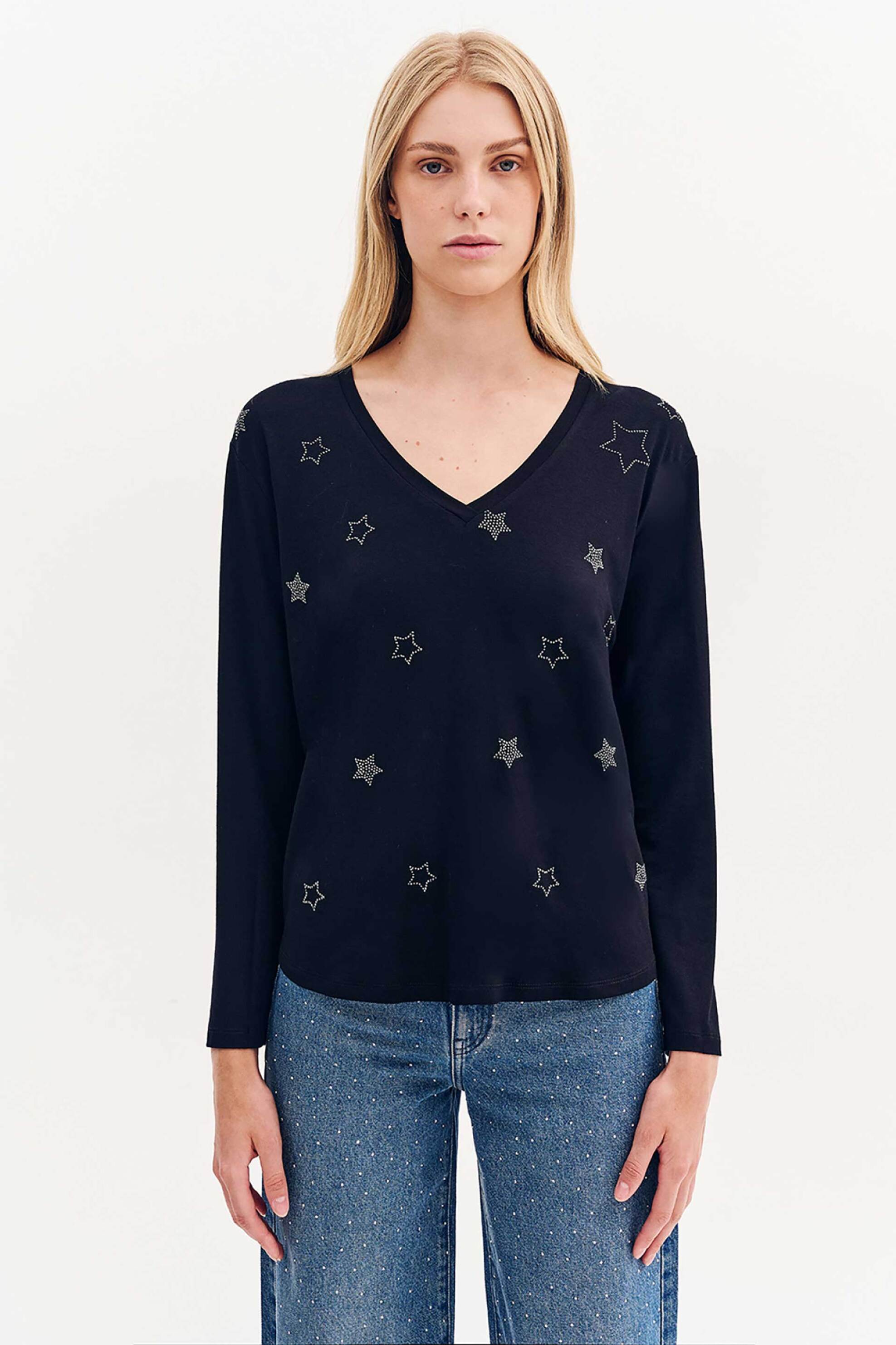 Γυναικεία μπλούζα. Μονόχρωμη. Σχέδιο αστεριών απο στρας. Mακρύ μανίκι. V λαιμόκοψη. Προέλευση: EU. 94% βισκόζη, 6% elastane FOREL Α.Ε.