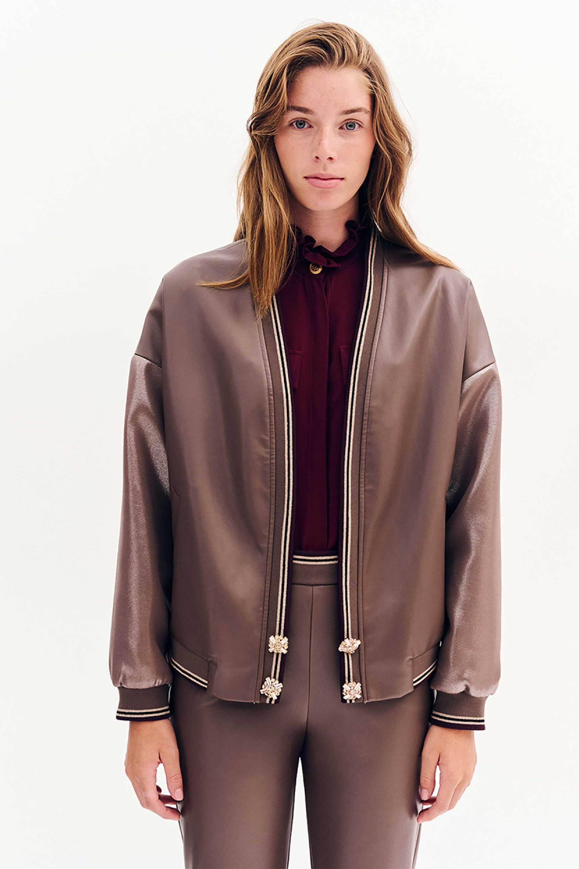 Γυναικεία ζακέτα. Faux δέρμα. Ribbed στα τελειώματα. Προέλευση: EU. 52% polyurethane, 45% pvc, 3% elastane FOREL Α.Ε.