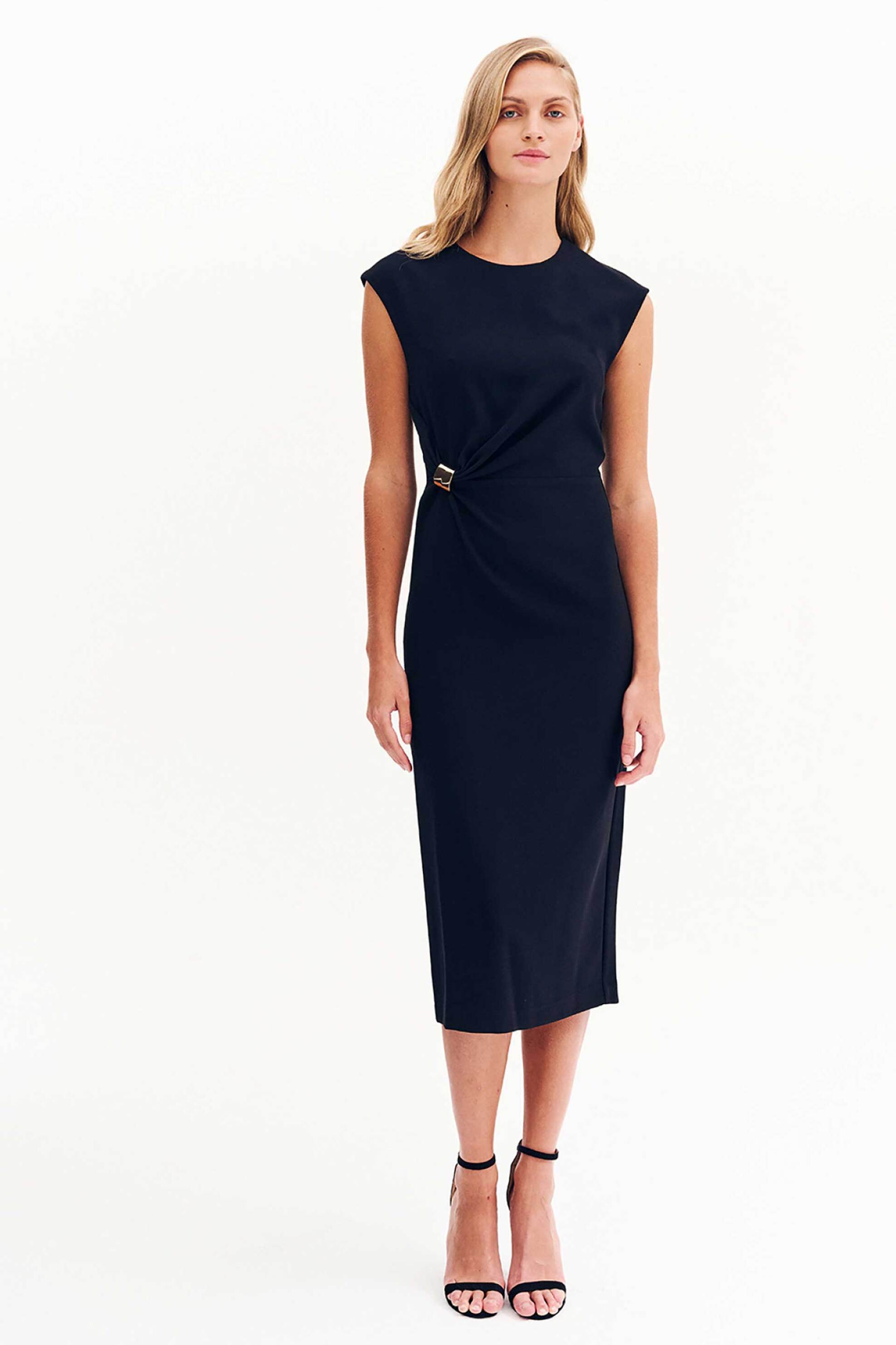 Γυναικείο midi φόρεμα. Αμάνικο. Pencil. Ντραπέ στην μέση. Στρογγυλή λαιμόκοψη. Κλείσιμο με κρυφό φερμουάρ. Χρυσή λεπτομέρεια. Προέλευση: EU. 62% polyester, 32% rayon, 6% spandex FOREL Α.Ε.