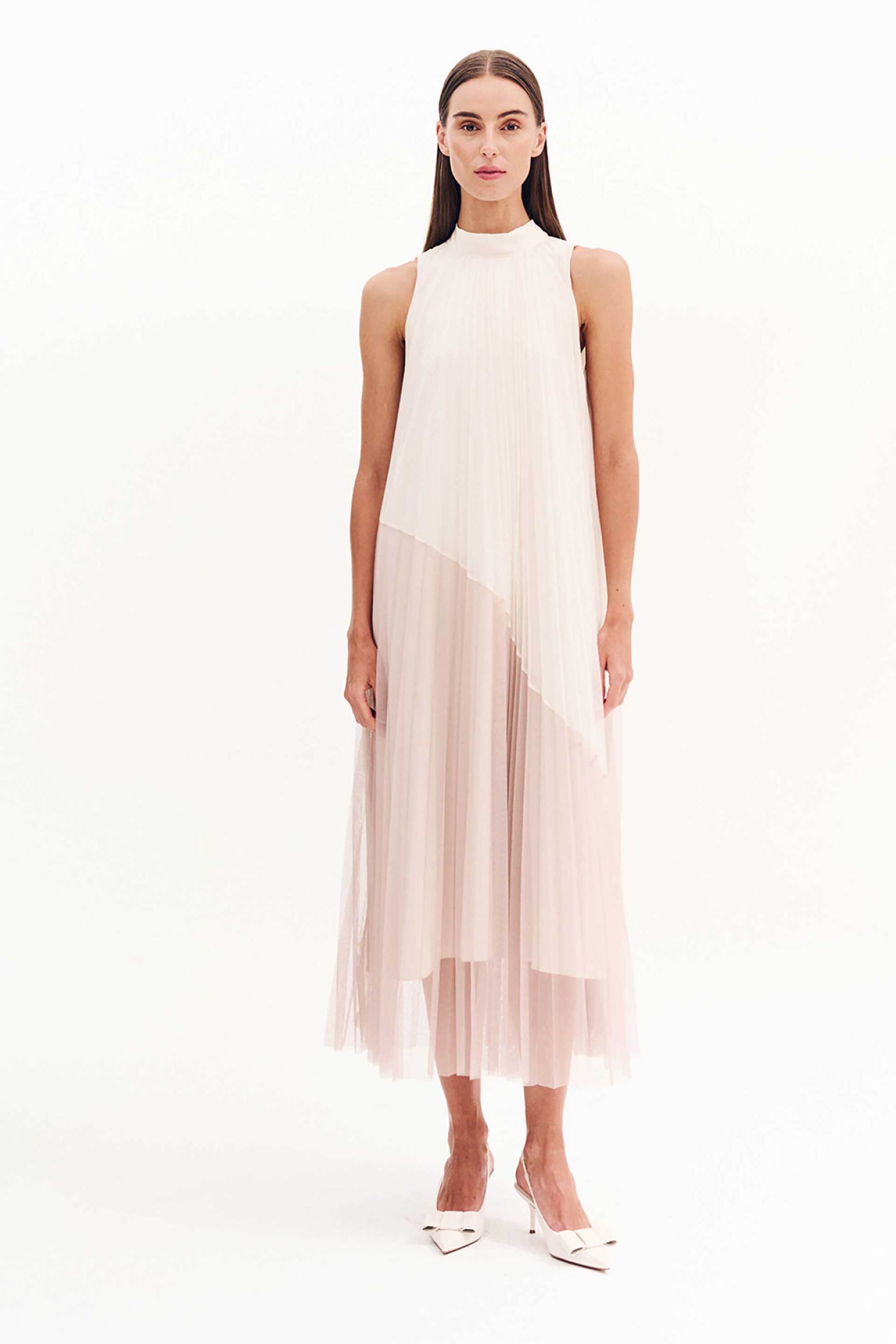 Γυναικείο midi φόρεμα. Αμάνικο. Πλισέ. Ψηλός λαιμός. Κλείσιμο με κουμπιά στο πίσω μέρος. Δέσιμο με κορδέλα. Προέλευση: EU. 100% polyester FOREL Α.Ε.