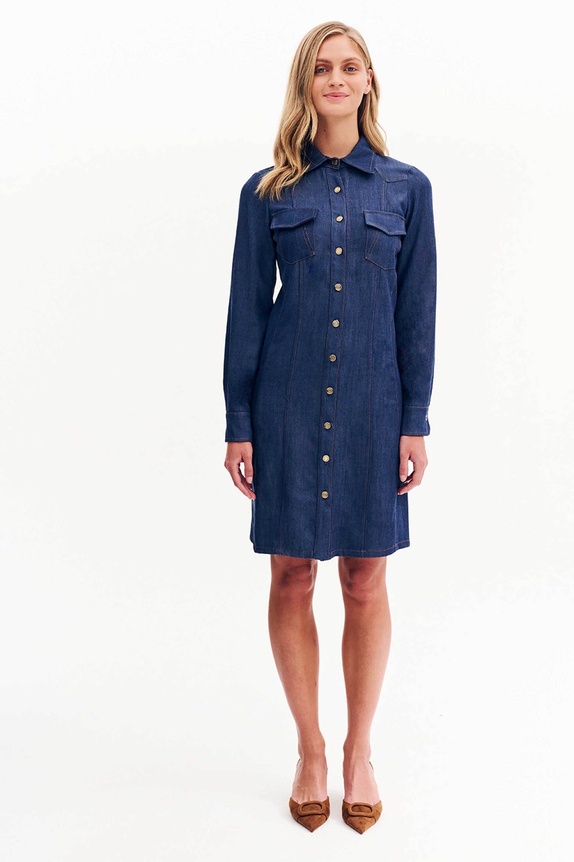 Γυναικείο mini φόρεμα. Denim. Σεμιζιέ. Kλασικός γιακάς. Μακρύ μανίκι. Flap τσέπες στο στήθος. Κλείσιμο με κουμπιά. Προέλευση: EU. 100% lyocell FOREL Α.Ε.