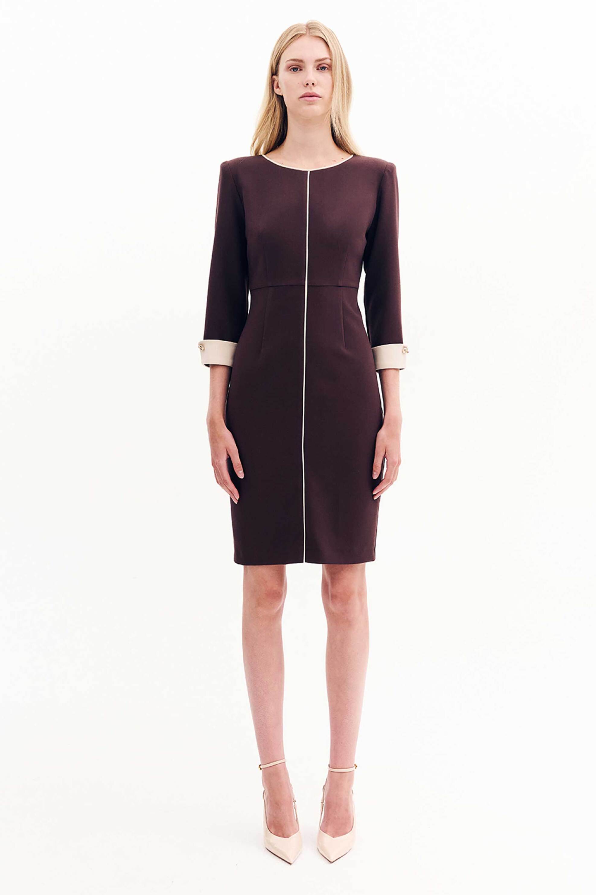 Γυναικείο midi φόρεμα. Pencil. Στρογγυλή λαιμόκοψη. Μανίκι 3/4. Ντραπέ στο μπροστά μέρος. Διακοσμητικά κουμπιά. Contrast λεπτομέρειες. Κλείσιμο με φερμουάρ στην πλάτη. Προέλευση: EU. 62% polyester, 32% rayon, 6% spandex FOREL Α.Ε.