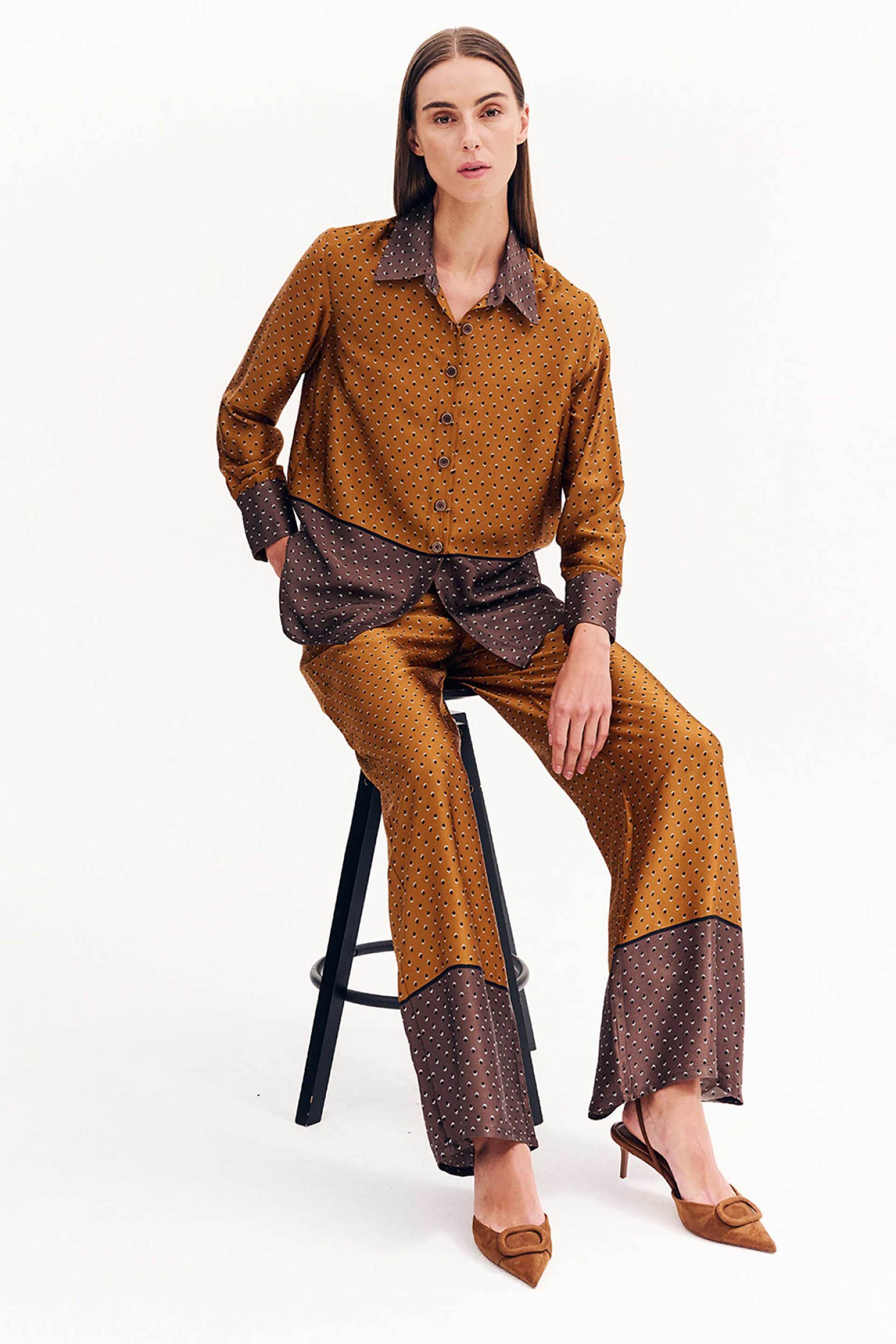 Γυναικείο παντελόνι. All-over print. Σατέν υφή. Ελαστική μέση. Tσέπες στο πλαί. Προέλευση: EU. 100% βισκόζη FOREL Α.Ε.