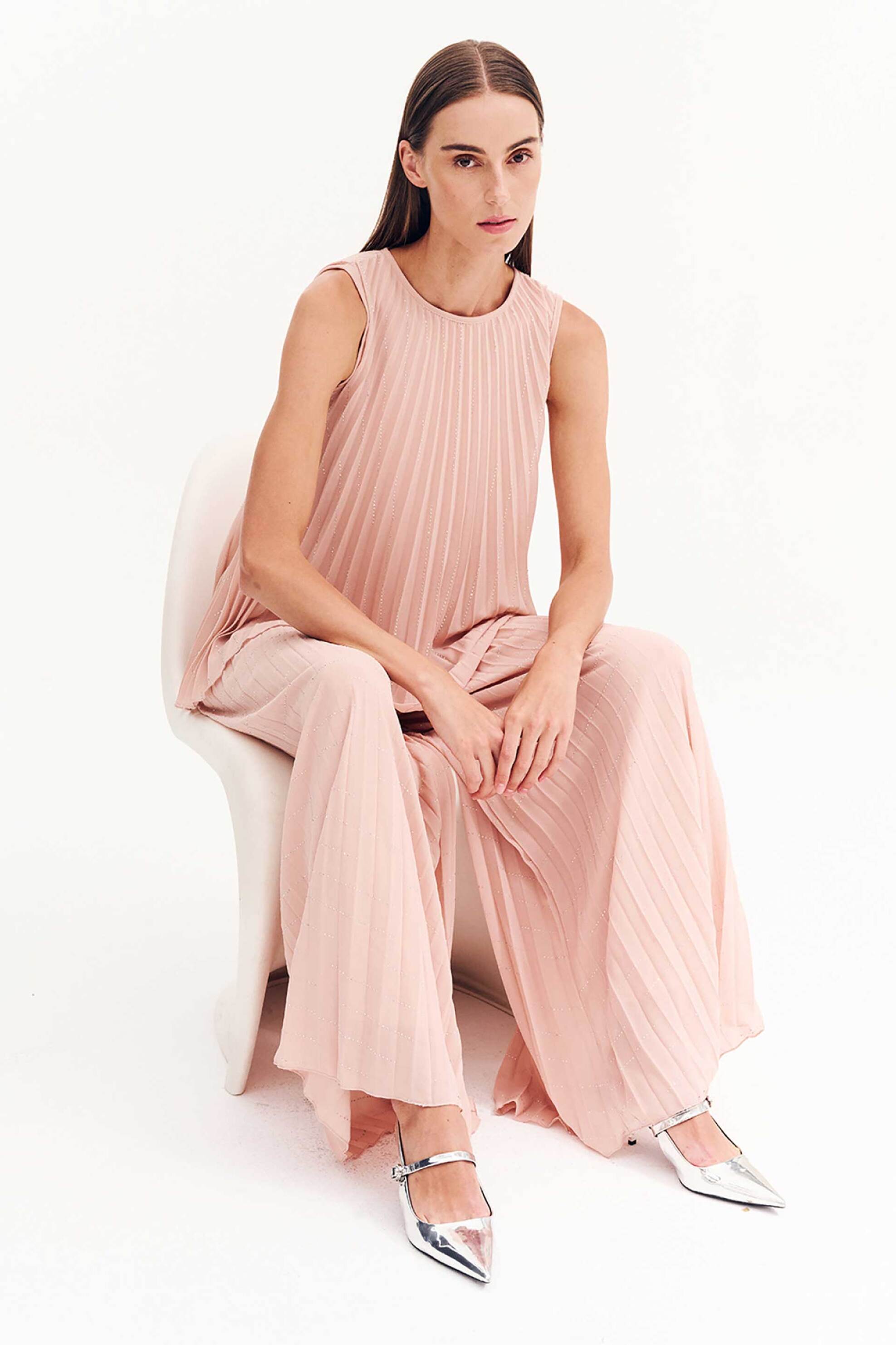 Γυναικείο παντελόνι. Πλισέ. Μονόχρωμο. Ελαστική μέση. Ίσια γραμμή. Προέλευση: EU. 100% polyester FOREL Α.Ε.