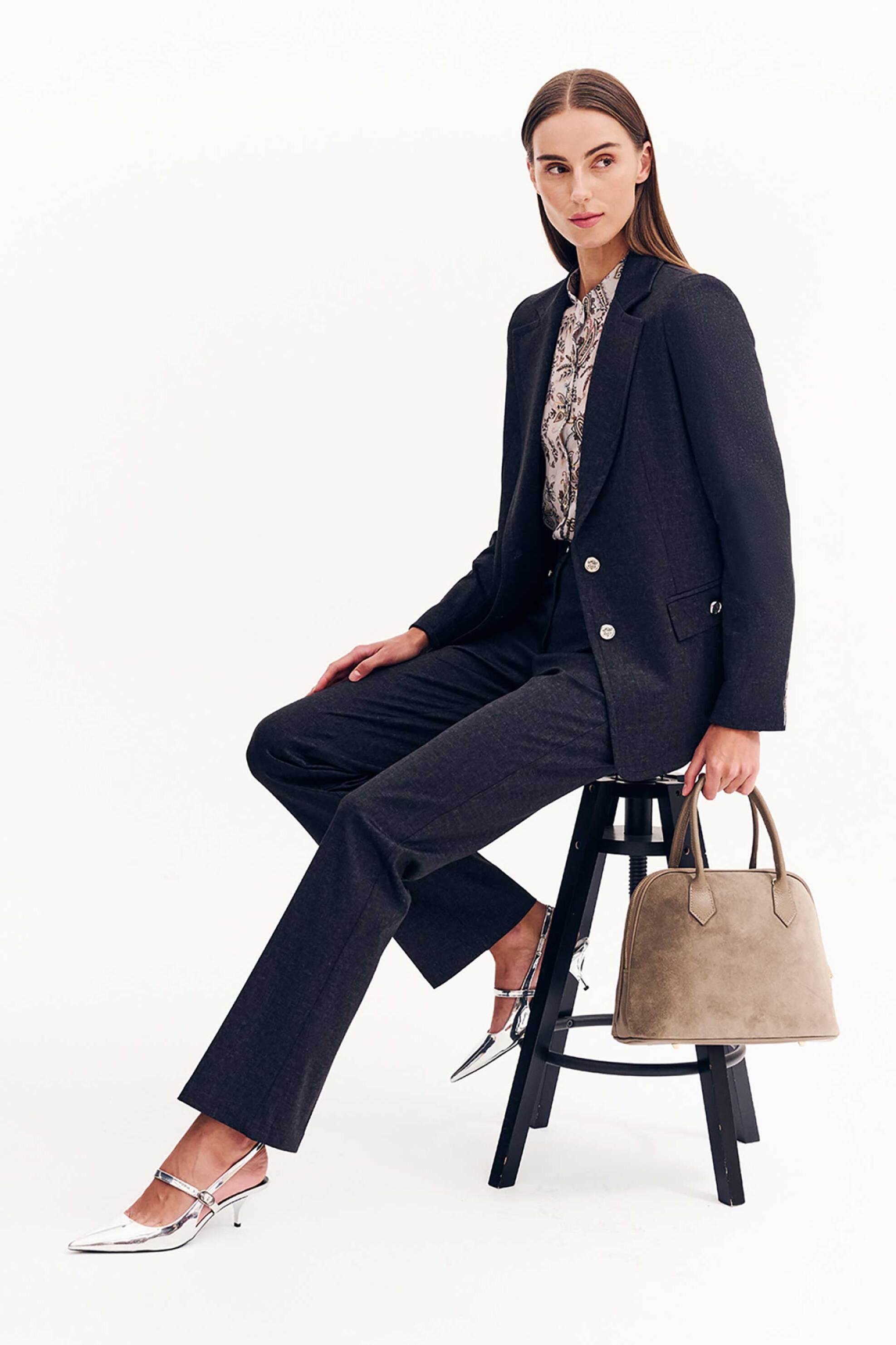 Γυναικείο παντελόνι. Ίσια γραμμή. Ψηλόμεσο. Διακοσμητικά κουμπιά. Κλείσιμο μπροστά με φερμουάρ και μεταλλικό κουμπί. Προέλευση: EU. 60% polyester, 35% βισκόζη, 5% elastane FOREL Α.Ε.%