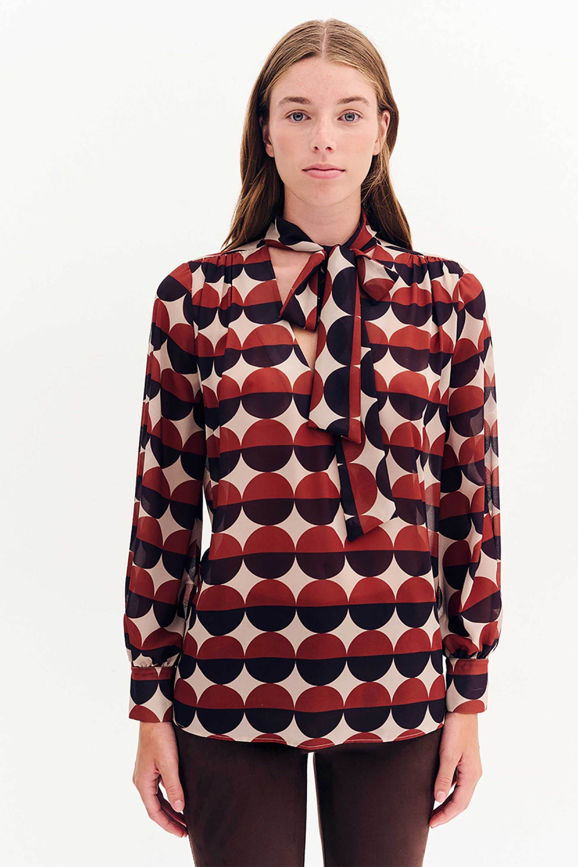 Γυναικείο πουκάμισο. Γεωμετρικό σχέδιο. Δέσιμο στο λαιμό με κορδέλα. Μακρύ μανίκι. Μανσέτες με κουμπιά. Προέλευση: EU. 100% polyester FOREL Α.Ε.