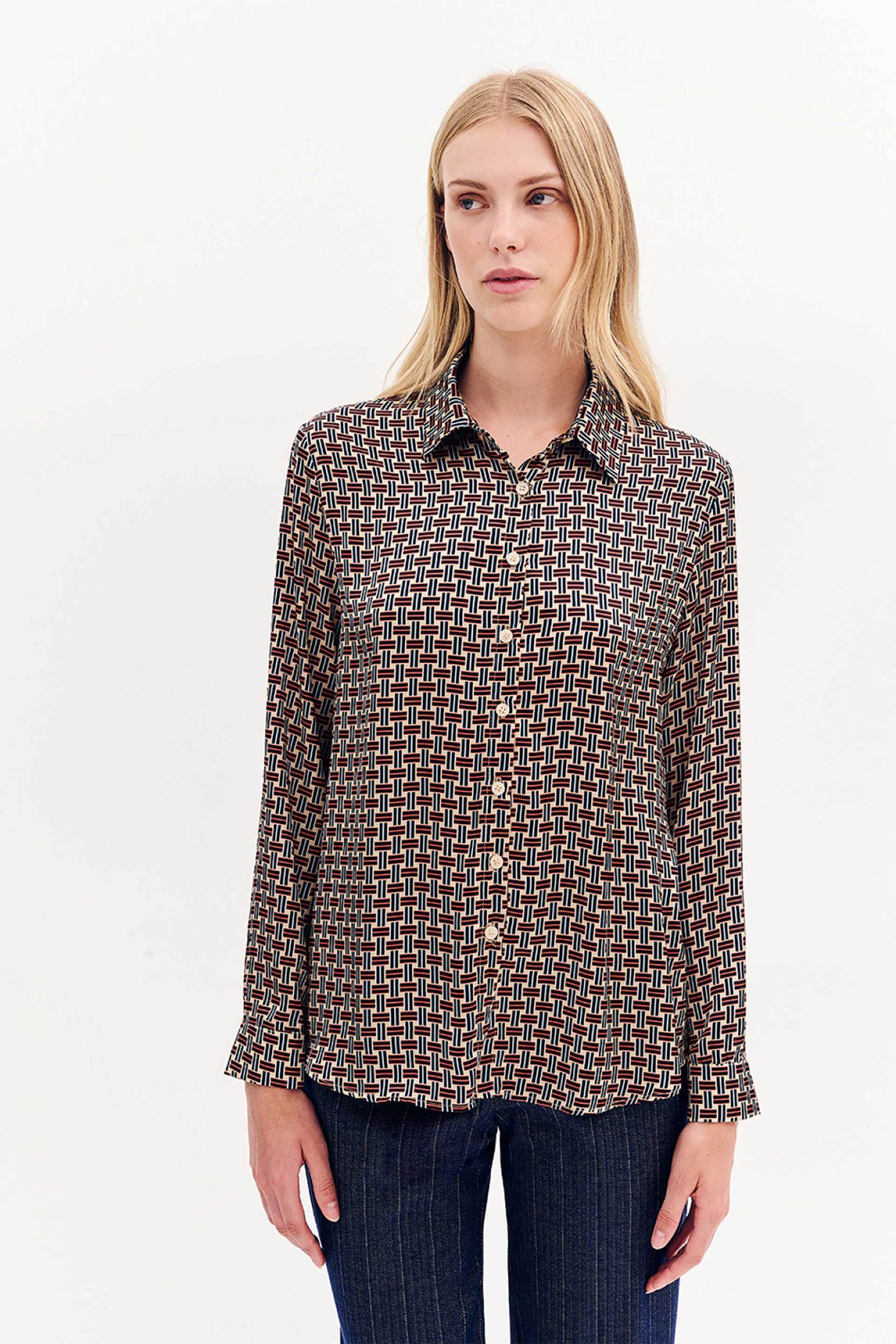 Γυναικείο πουκάμισο. Γεωμετρικό σχέδιο. Σατέν υφή. Κλασικός γιακάς. Μακρύ μανίκι. Κλείσιμο μπροστά με κουμπιά. Προέλευση: EU. 100% polyester FOREL Α.Ε.