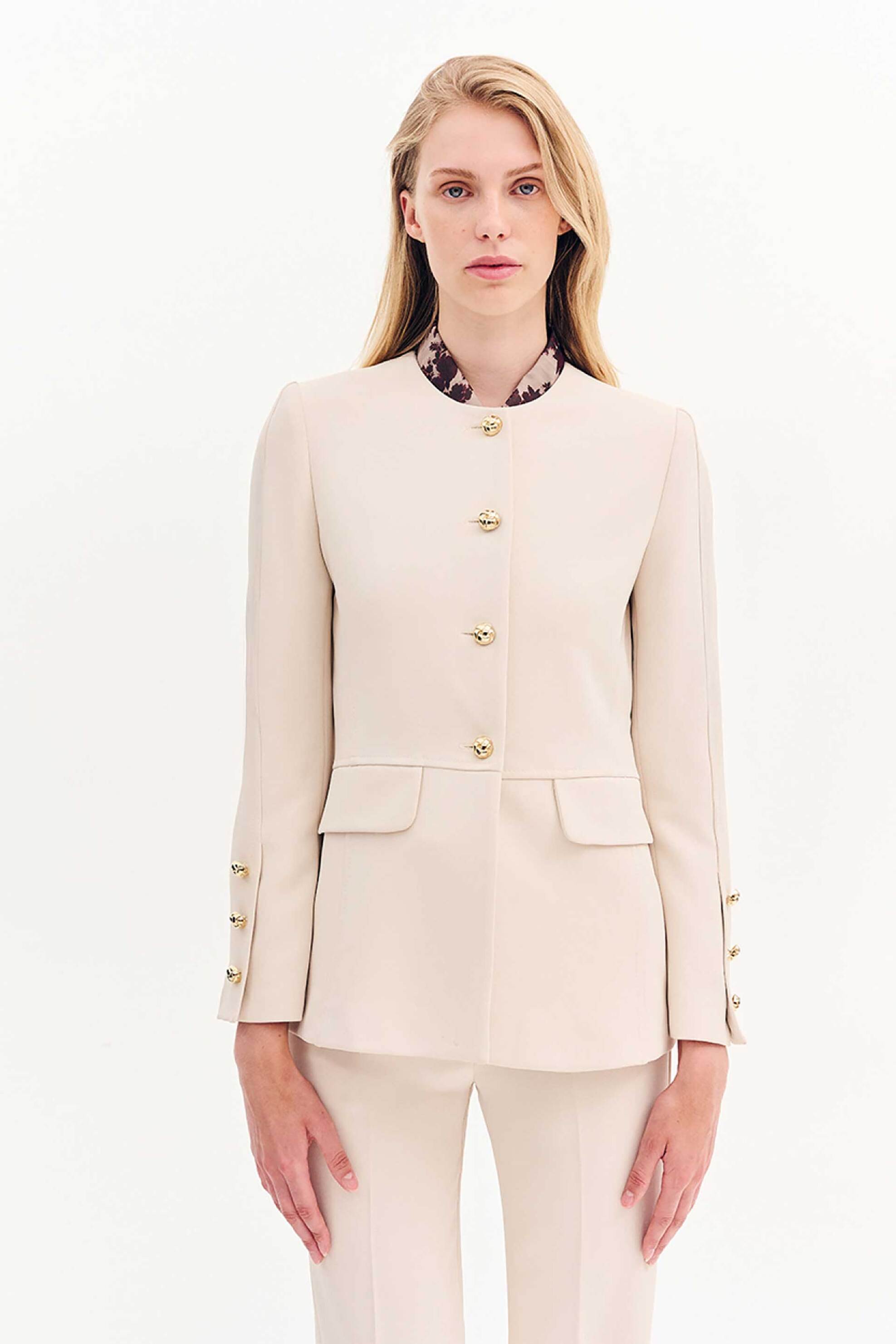 Γυναικείο σακάκι. Μονόχρωμο. Μεσάτο. Διακοσμητικά χρυσά κουμπιά. Στρογγυλή λαιμόκοψη. Μακρύ μανίκι. Τσέπες στο πλάι. Κλείσιμο με κουμπιά. Προέλευση: EU. 95% polyester, 5% elastane FOREL Α.Ε.