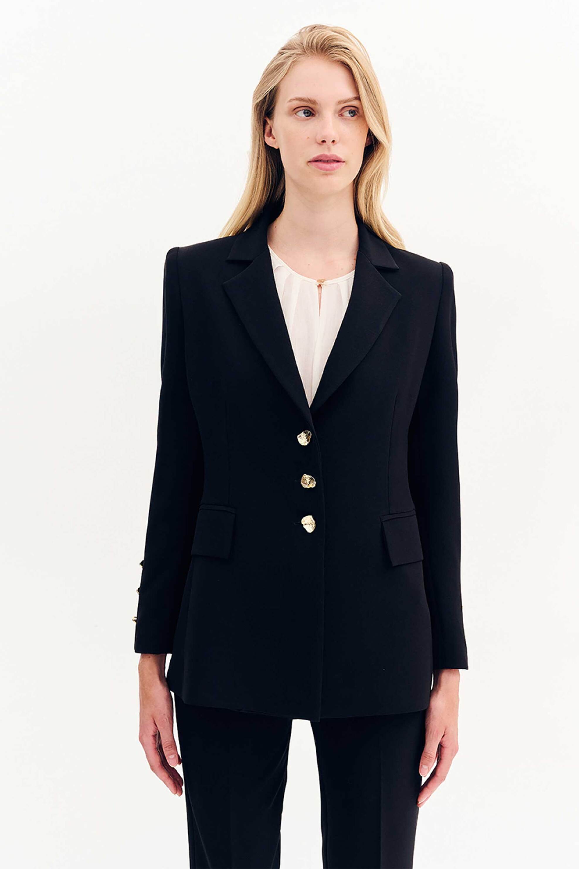 Γυναικείο σακάκι. Μονόχρωμο. Μεσάτο. Μακρύ μανίκι. Κλασικός γιακάς. Τσέπες στο πλάι. Κλείσιμο με χρυσά κουμπιά. Προέλευση: EU. 95% polyester, 5% elastane FOREL Α.Ε.
