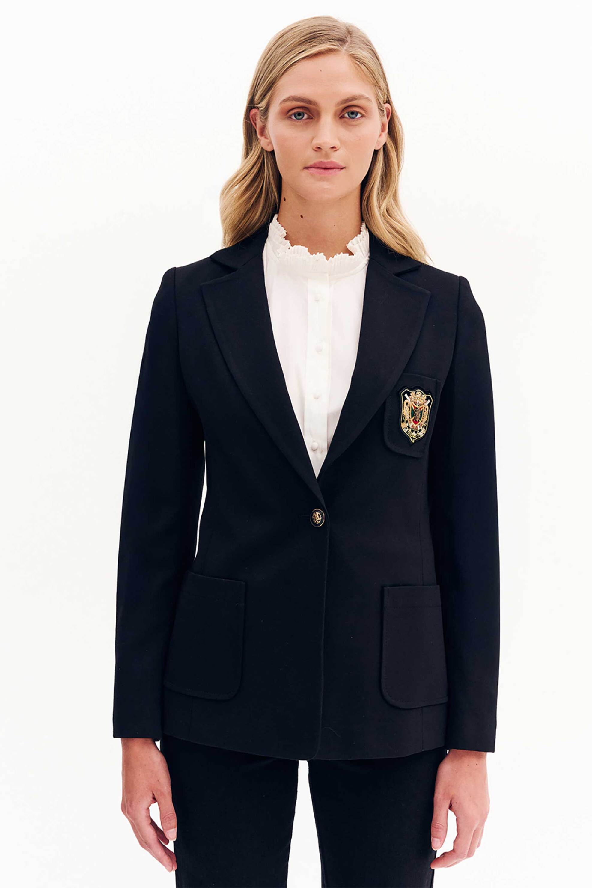 Γυναικείο σακάκι. Μονόχρωμο. Μεσάτο. Διακοσμητικό οικόσημο στο μπροστινό μέρος. Μακρύ μανίκι. Κλασικός γιακάς. Τσέπες στο πλάι. Κλείσιμο με κουμπί. Προέλευση: EU. 75% rayon, 20% nylon, 5% spandex FOREL Α.Ε.