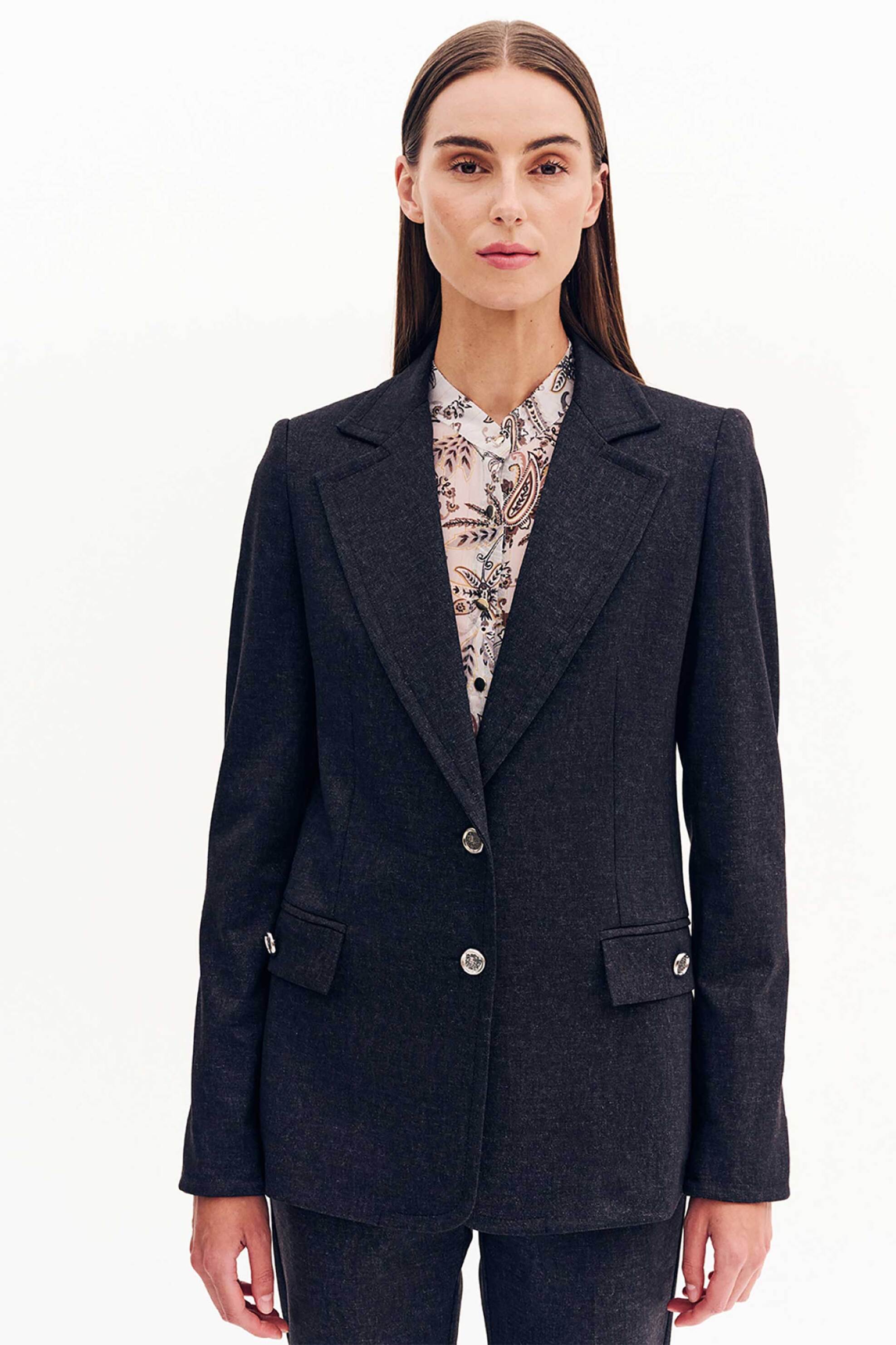 Γυναικείο σακάκι. Μονόχρωμο. Μεσάτο. Bάτες. Μακρύ μανίκι. Διακοσμητικά ασημένια κουμπιά. Κλασικός γιακάς. Τσέπες στο πλάι. Κλείσιμο με κουμπιά. Προέλευση: EU. 60% polyester, 35% βισκόζη, 5% elastane FOREL Α.Ε.