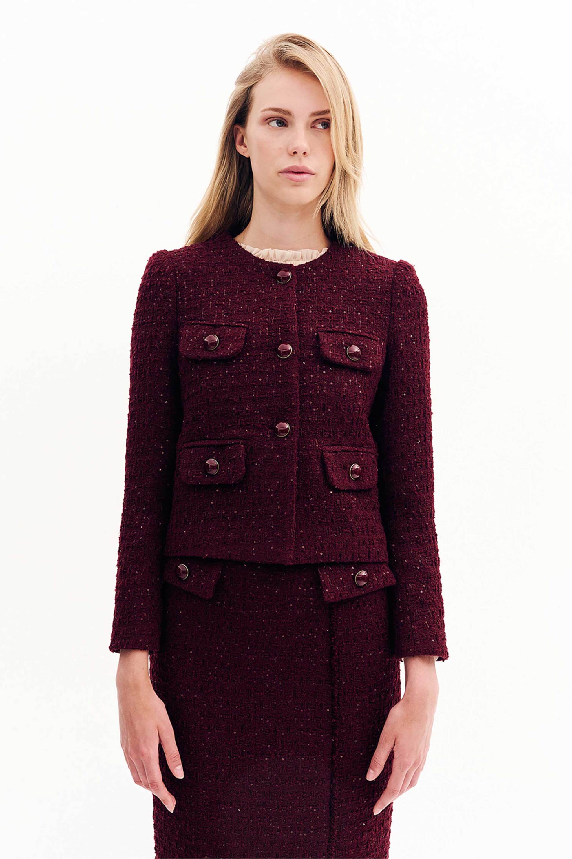 Γυναικείο σακάκι. Tweed σχέδιο. Λεπτή παγιέτα στην ύφανση. Mακρύ μανίκι. Κλείσιμο με κουμπιά. Στρογγυλή λαιμόκοψη. Flap τσέπες στο πλάι και στο στήθος. Προέλευση: EU. 80% polyester, 20% μαλλί FOREL Α.Ε.