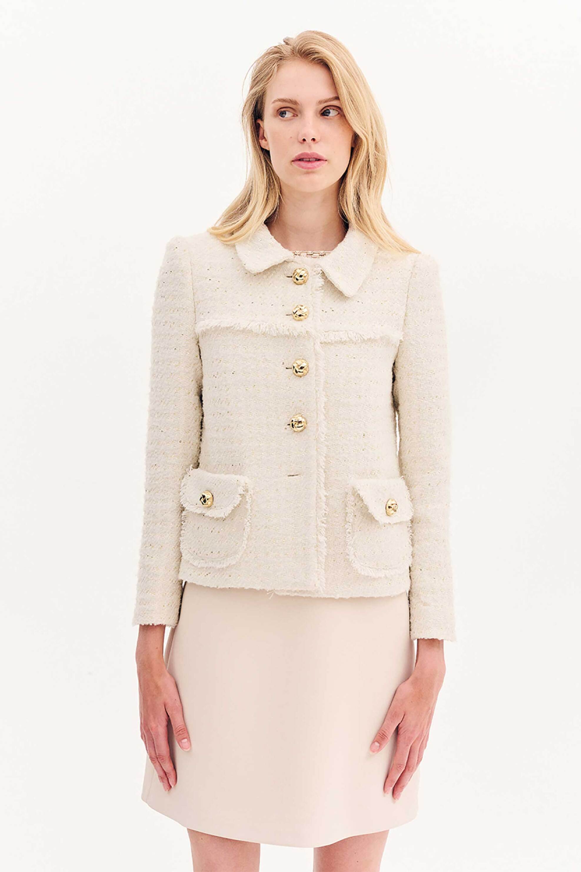 Γυναικείο σακάκι. Mακρύ μανίκι. Κλείσιμο με κουμπιά. Κλασικός γιακάς. Flap τσέπες στο πλάι. Tweed σχέδιο. Προέλευση: EU. 100% polyester FOREL Α.Ε.