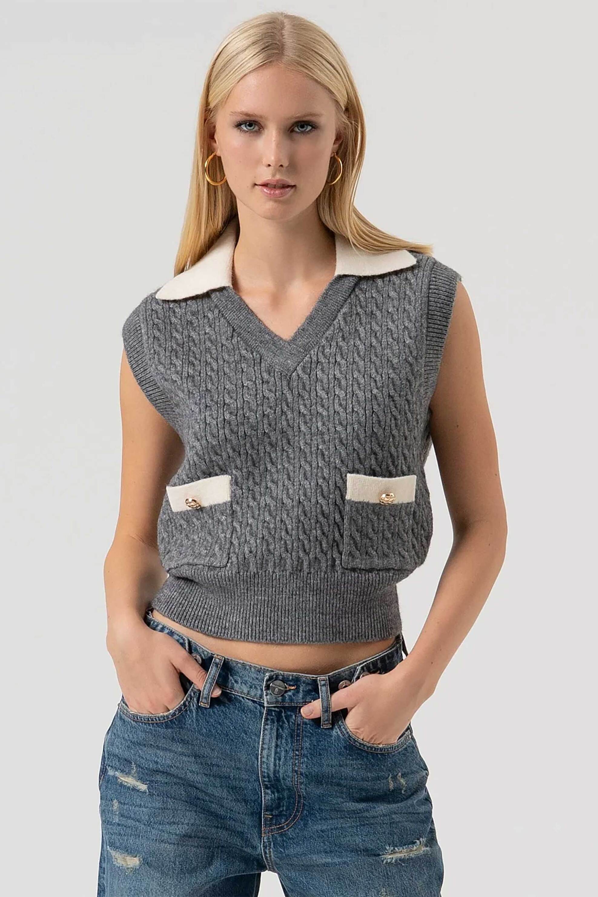 Γυναικεία πλεκτή μπλούζα. Aμάνικη. Γιακάς. Τσέπες στο πλάι. Regular fit. Προέλευση: CN. 58% acrylic, 35% polyester, 7% spandex Το μοντέλο έχει ύψος 175 cm και φοράει νούμερο S. PFCMNA SPA