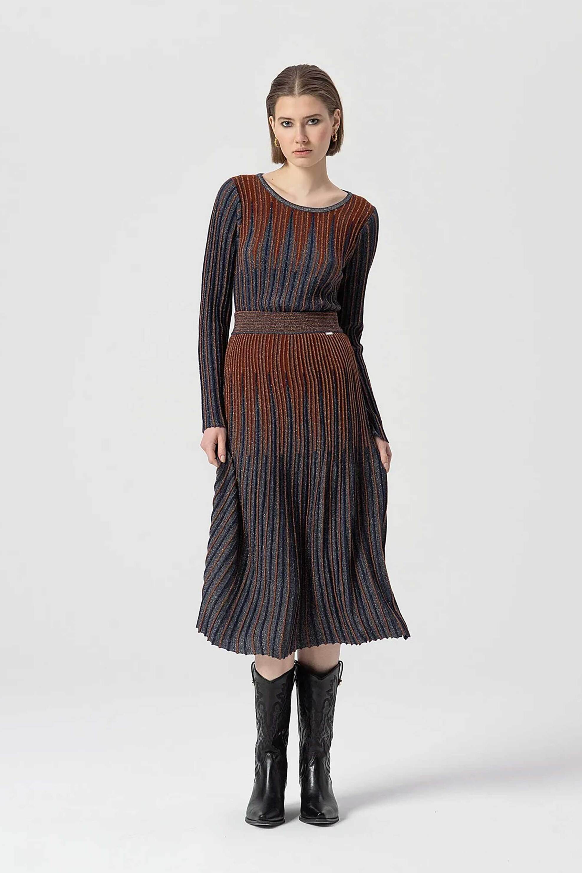 Γυναικεία midi φούστα. Ριγέ σχέδιο. Ελαστική μέση. Ribbed. Προέλευση: CN. 34% polyamide, 30% polyester, 20% βισκόζη, 10% lurex, 6% μαλλί Το μοντέλο έχει ύψος 175 cm και φοράει νούμερο S. PFCMNA SPA