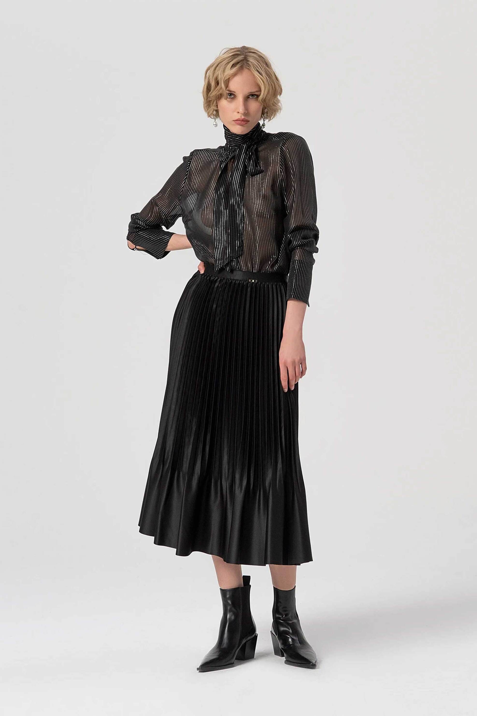 Γυναικεία midi πλισέ φούστα. Μονόχρωμη. Ψηλόμεση. Ελαστική μέση. Προέλευση: CN. 100% polyester Το μοντέλο έχει ύψος 175 cm και φοράει νούμερο S. PFCMNA SPA