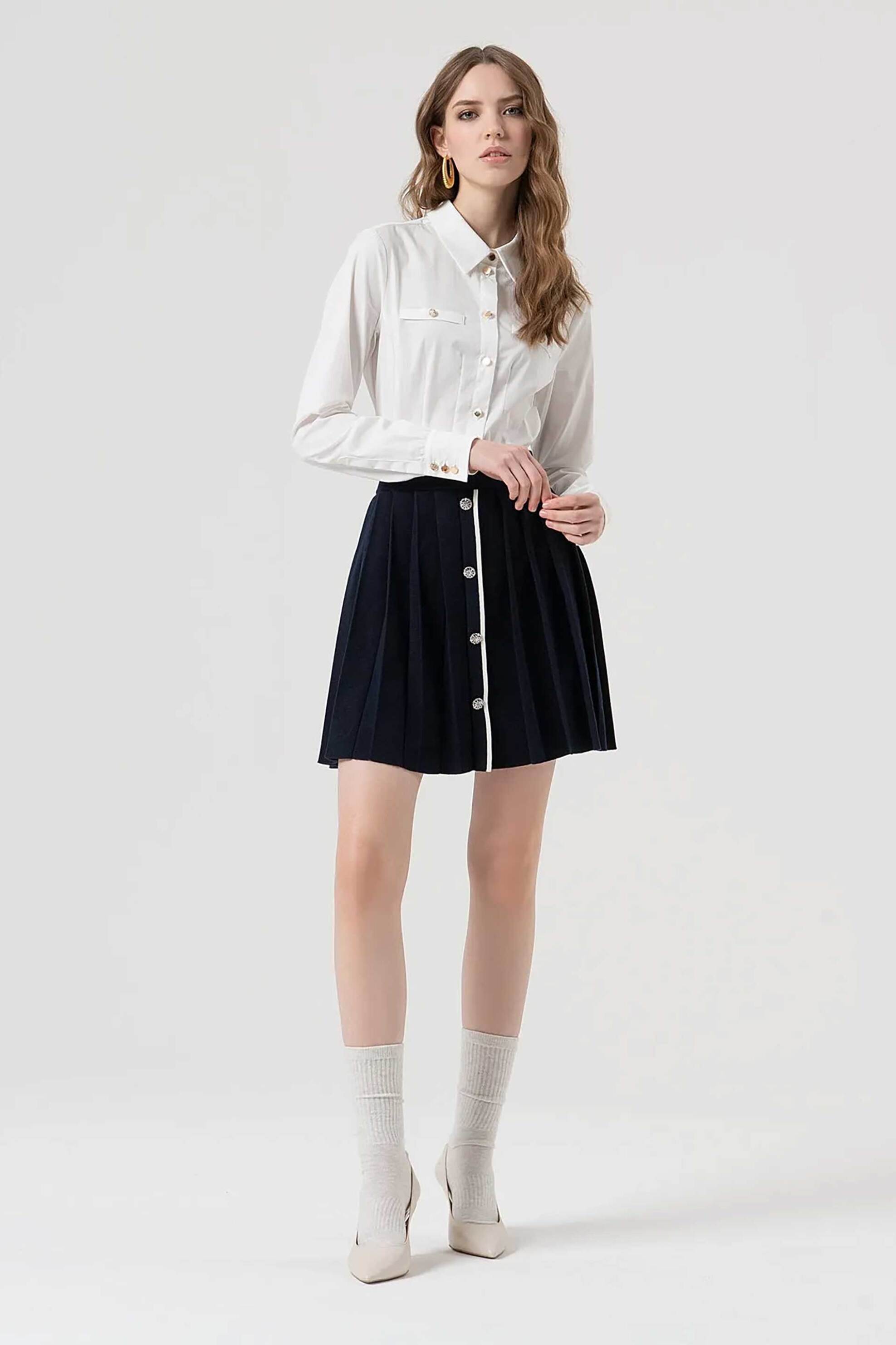 Γυναικεία mini πλισέ φούστα. Διακοσμητικά μεταλλικά κουμπιά. Α γραμμή. Ελαστική μέση. Προέλευση: CN. 54% polyester, 20% acrylic, 20% nylon, 6% μαλλί Το μοντέλο έχει ύψος 175 cm και φοράει νούμερο S. PFCMNA SPA