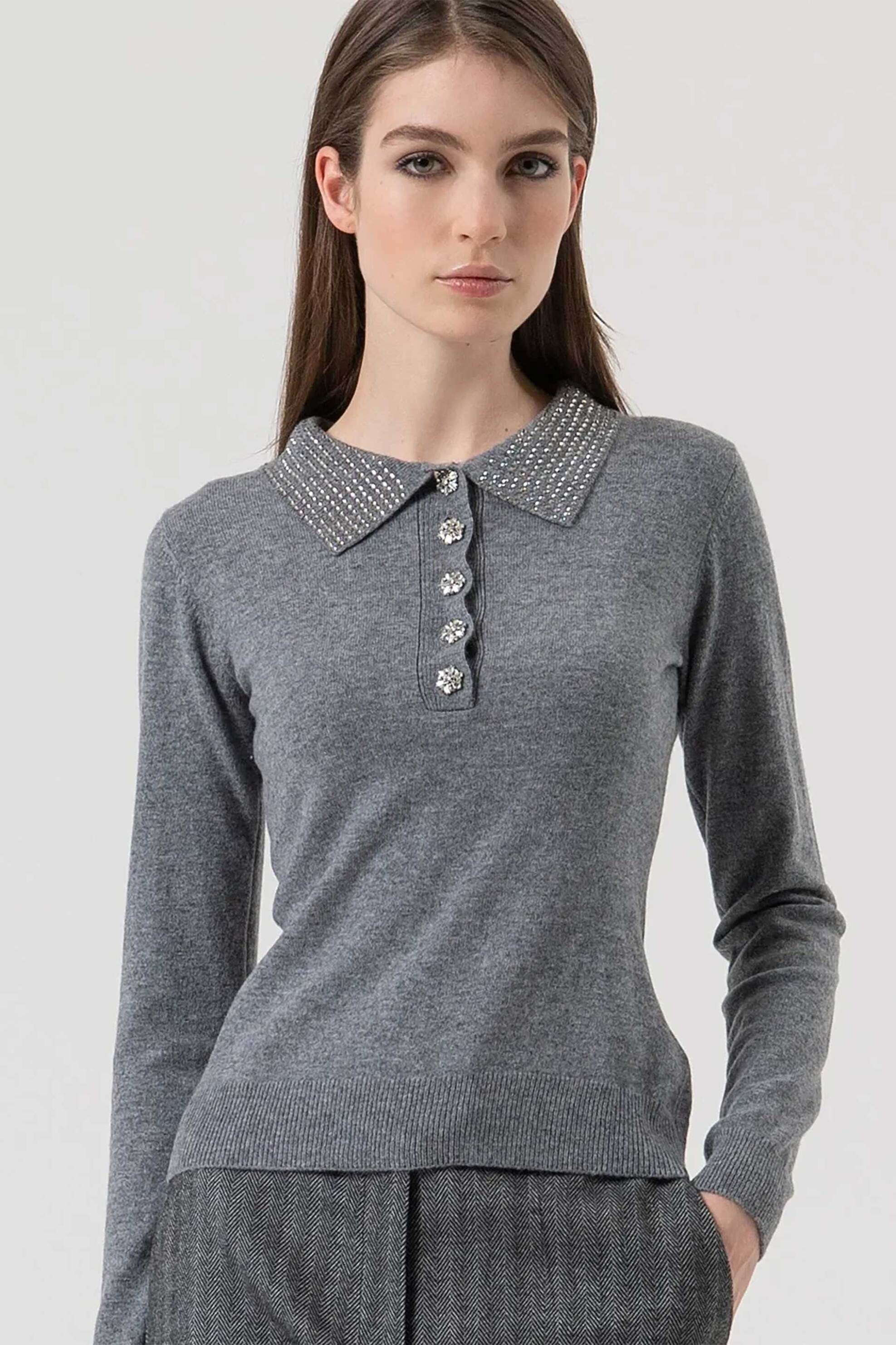 Γυναικεία μπλούζα πόλο. Μονόχρωμη. Πατιλέτα με 5 κουμπιά. Γιακάς με στρας. Μακρύ μανίκι. Regular fit. Προέλευση: CN. 90% μαλλί, 6% κασμίρ Το μοντέλο έχει ύψος 175 cm και φοράει νούμερο S. PFCMNA SPA