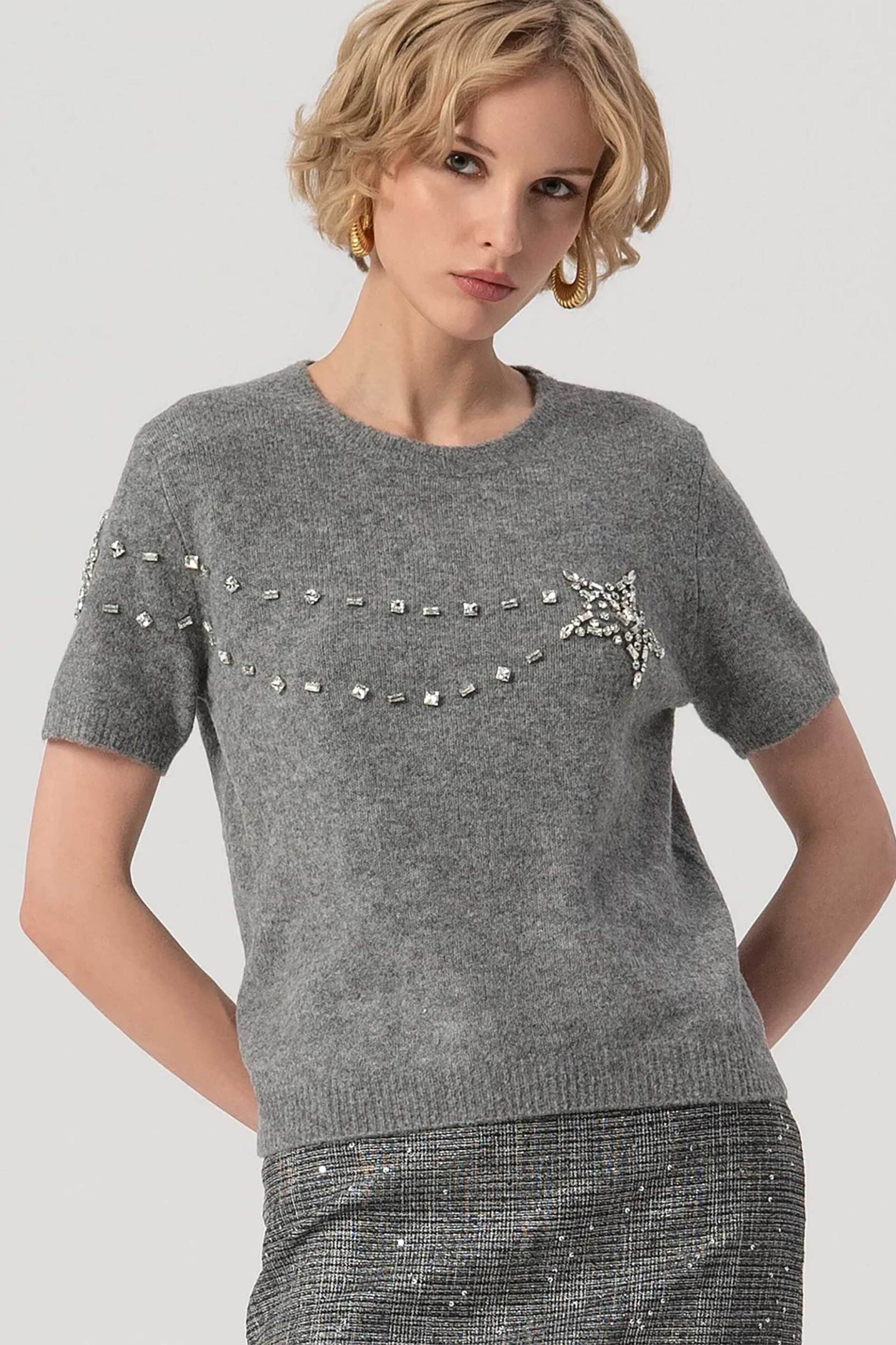 Γυναικεία πλεκτή μπλούζα. Διακοσμητικές πέτρες. Στρογγυλή λαιμόκοψη. Κοντό μανίκι. Ribbed. Προέλευση: CN. 43% polyester, 26% polyamide, 22% acrylic, 5% μαλλί, 4% spandex Το μοντέλο έχει ύψος 175 cm και φοράει νούμερο S. PFCMNA SPA