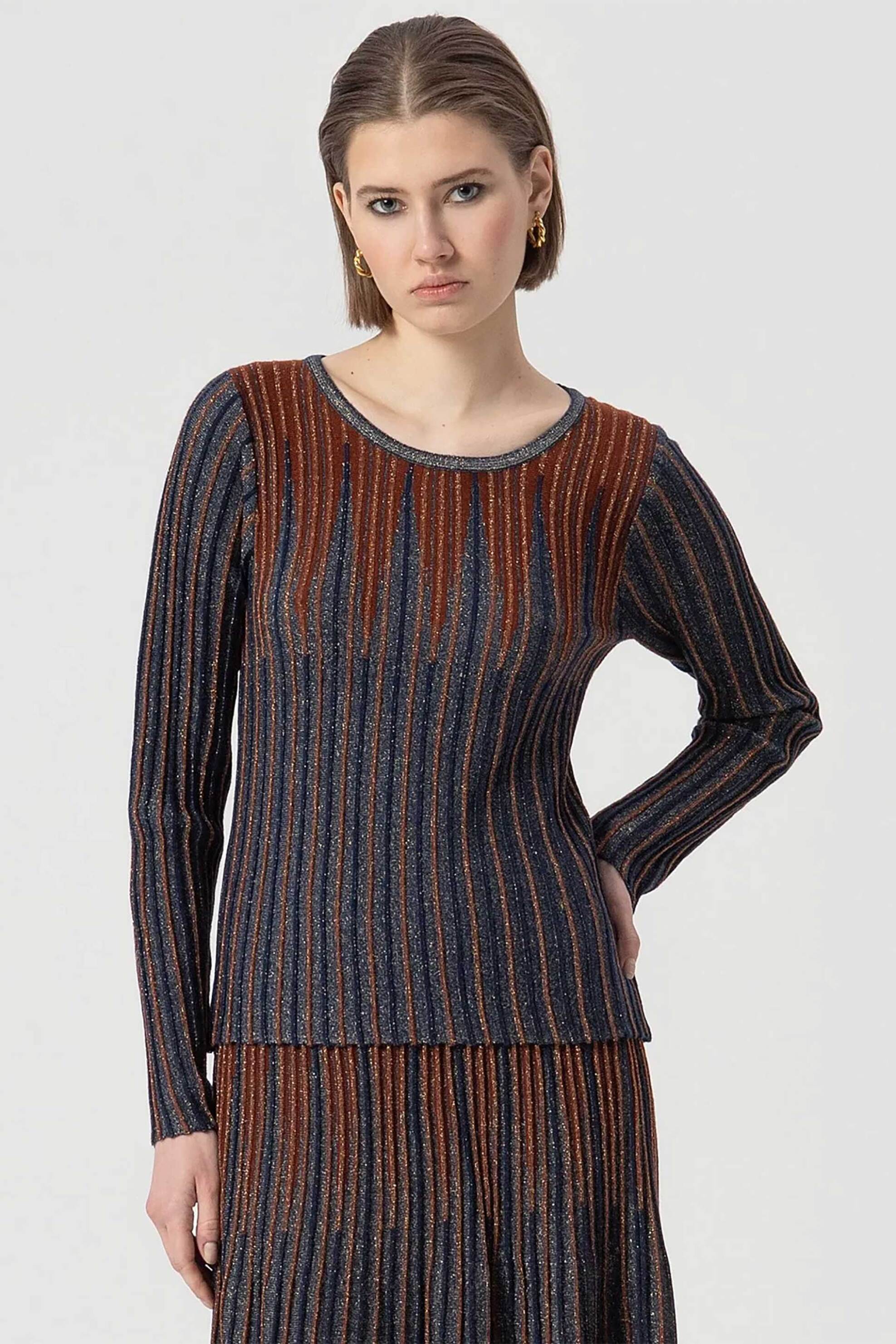 Γυναικεία πλεκτή μπλούζα. Δίχρωμη. Στρογγυλή λαιμόκοψη. Mακρύ μανίκι. Προέλευση: CN. 34% polyamide, 30% polyester, 20% βισκόζη, 10% lurex, 6% μαλλί Το μοντέλο έχει ύψος 175 cm και φοράει νούμερο S. PFCMNA SPA