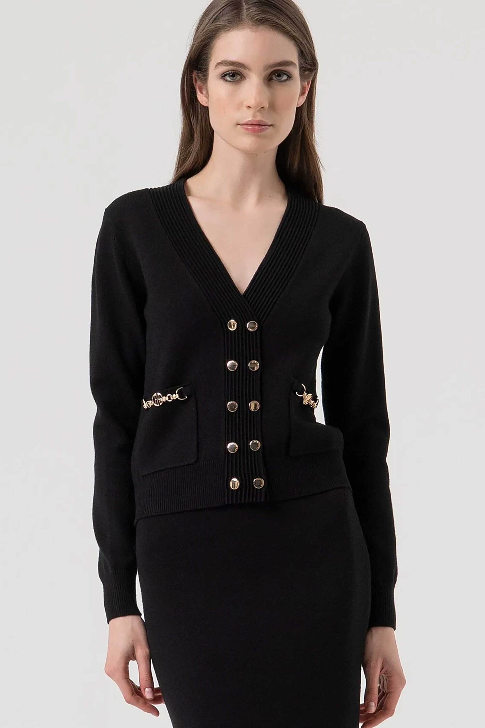 Γυναικεία ζακέτα. Μονόχρωμη. V λαιμόκοψη. Ribbed ύφανση. Κλείσιμο με χρυσά κουμπιά. Τσέπες στο πλάι με αγκράφες. Μακρύ μανίκι. Regular fit. Προέλευση: CN. 62% βισκόζη, 38% polyester Το μοντέλο έχει ύψος 175 cm και φοράει νούμερο S. PFCMNA SPA