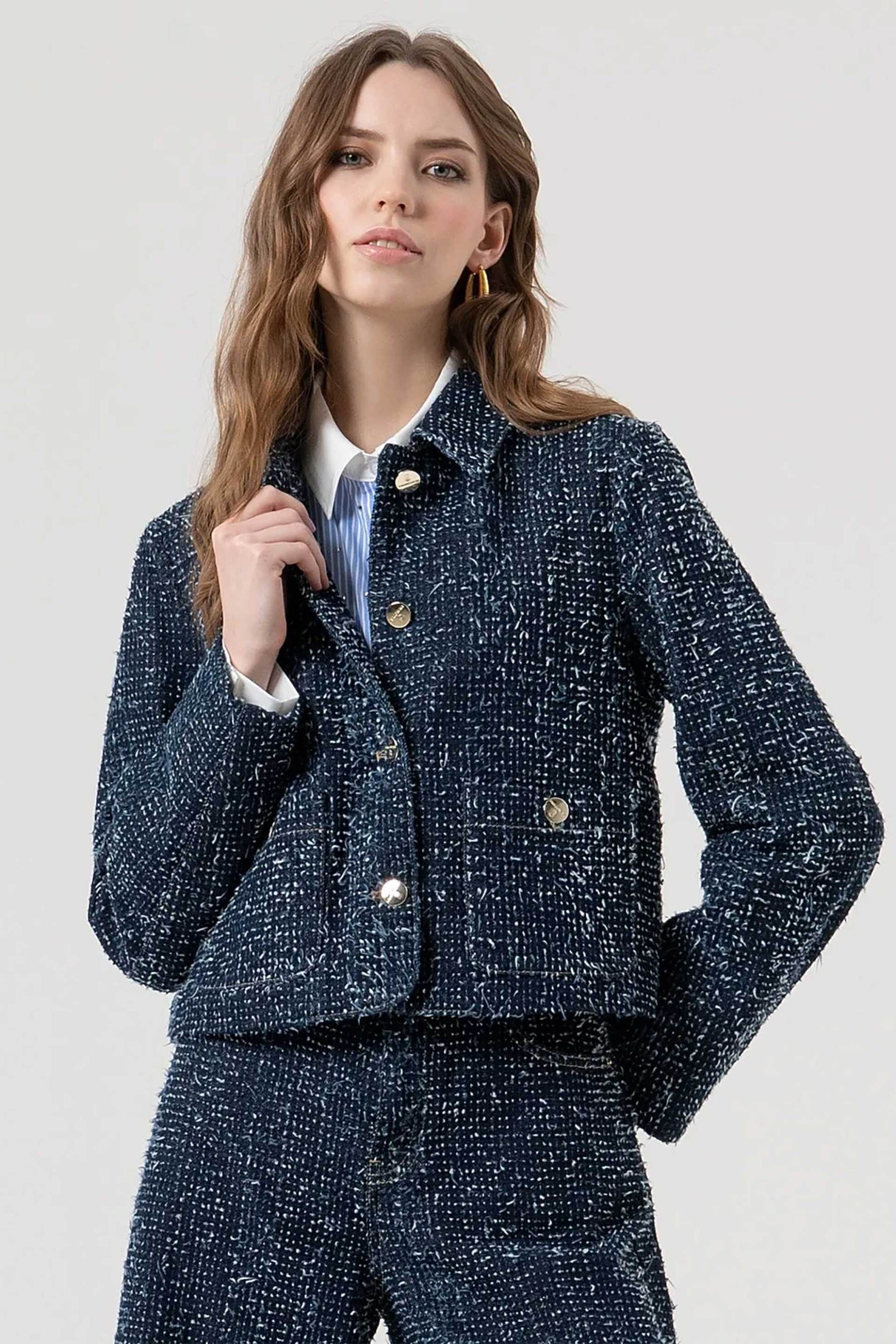 Γυναικείο denim σακάκι. Μπουκλέ υφή. Κλασικός γιακάς. Μακρύ μανίκι. Flap τσέπες μπροστά. Κλείσιμο με κουμπιά. Προέλευση: ΤR. 100% βαμβάκι Το μοντέλο έχει ύψος 175 cm και φοράει νούμερο S. PFCMNA SPA