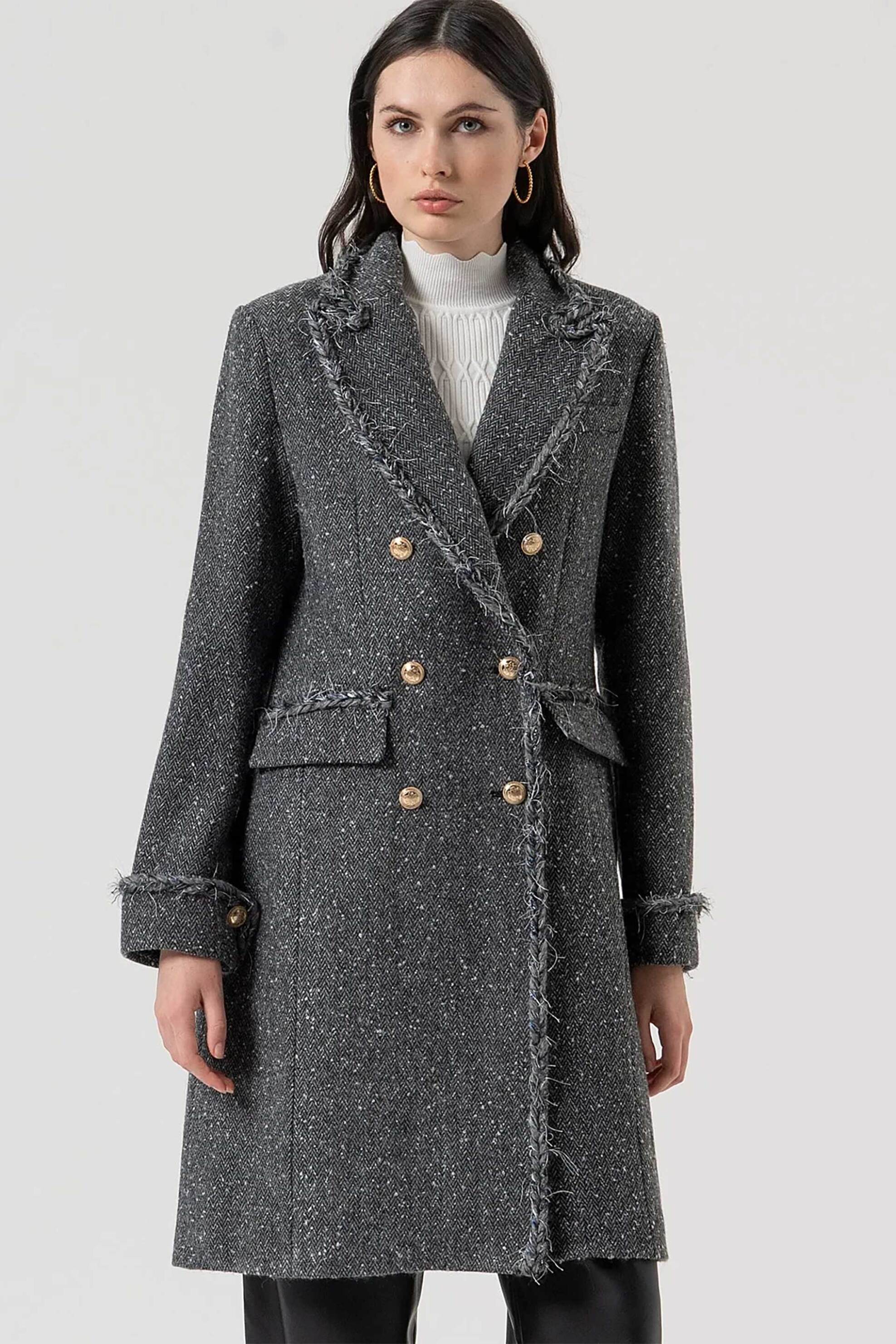 Γυναικείο maxi παλτό. Tweed σχέδιο. Μακρύ μανίκι. Kλασικός γιακάς. Κλείσιμο με κουμπιά. Flap τσέπες στο πλάι. Slim fit. Προέλευση: CN. 70% acrylic, 20% polyester, 10% μαλλί Το μοντέλο έχει ύψος 175 cm και φοράει νούμερο S. PFCMNA SPA