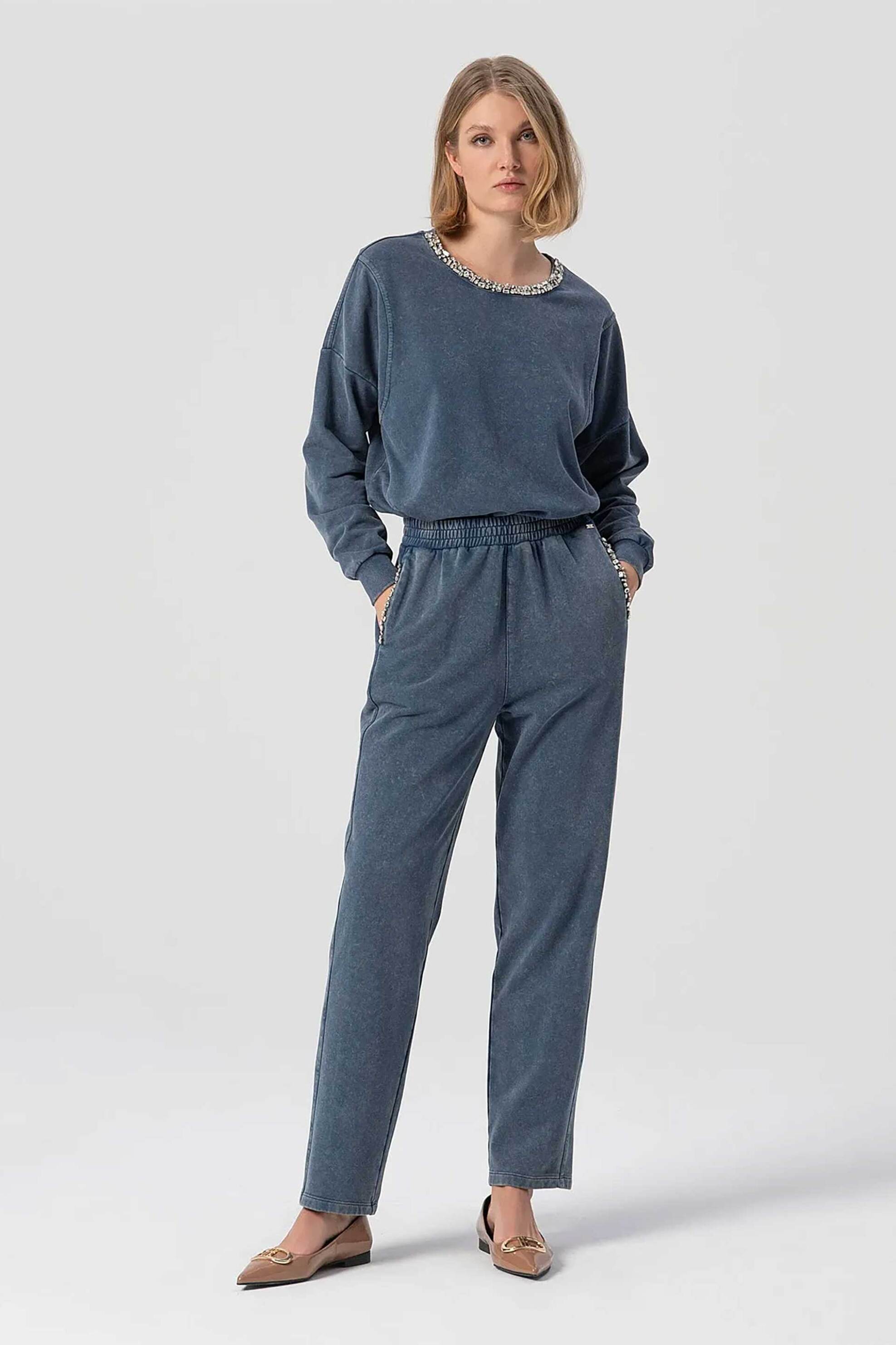 Γυναικείο παντελόνι φόρμας fleece. Ελαστική μέση. Eφέ μεταχειρισμένου υφάσματος. Τσέπες στο πλάι. Διακοσμητικές πέτρες. Προέλευση: CN. 100% βαμβάκι Το μοντέλο έχει ύψος 175 cm και φοράει νούμερο S. PFCMNA SPA