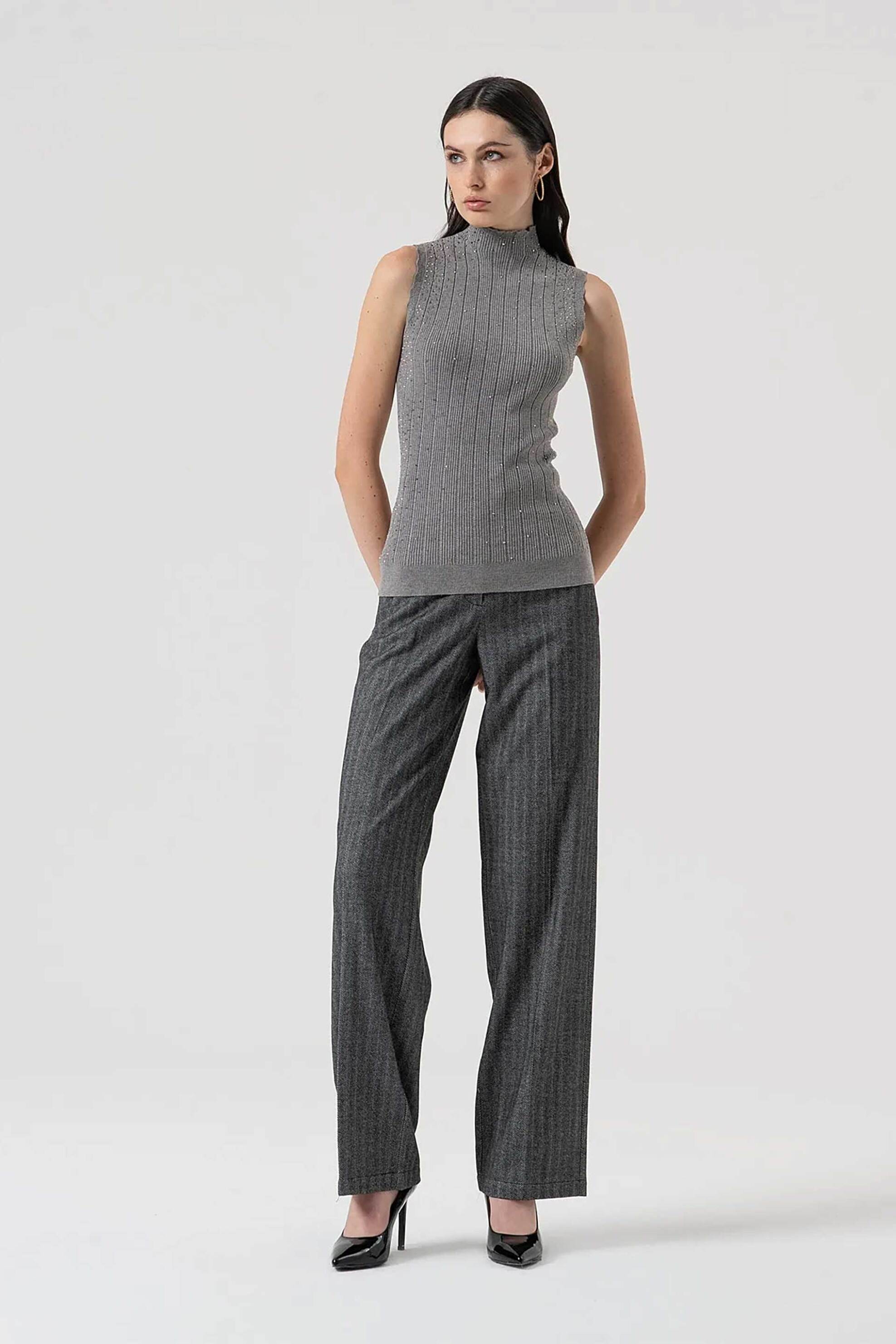 Γυναικείο παντελόνι. Ριγέ σχέδιο. Ψηλόμεσο. Κλείσιμο με φερμουάρ και κόπιτσα. Πλαϊνές τσέπες. Straight fit. Προέλευση: CN. 63% polyester, 33% βισκόζη, 4% elastane Το μοντέλο έχει ύψος 175 cm και φοράει νούμερο S. PFCMNA SPA