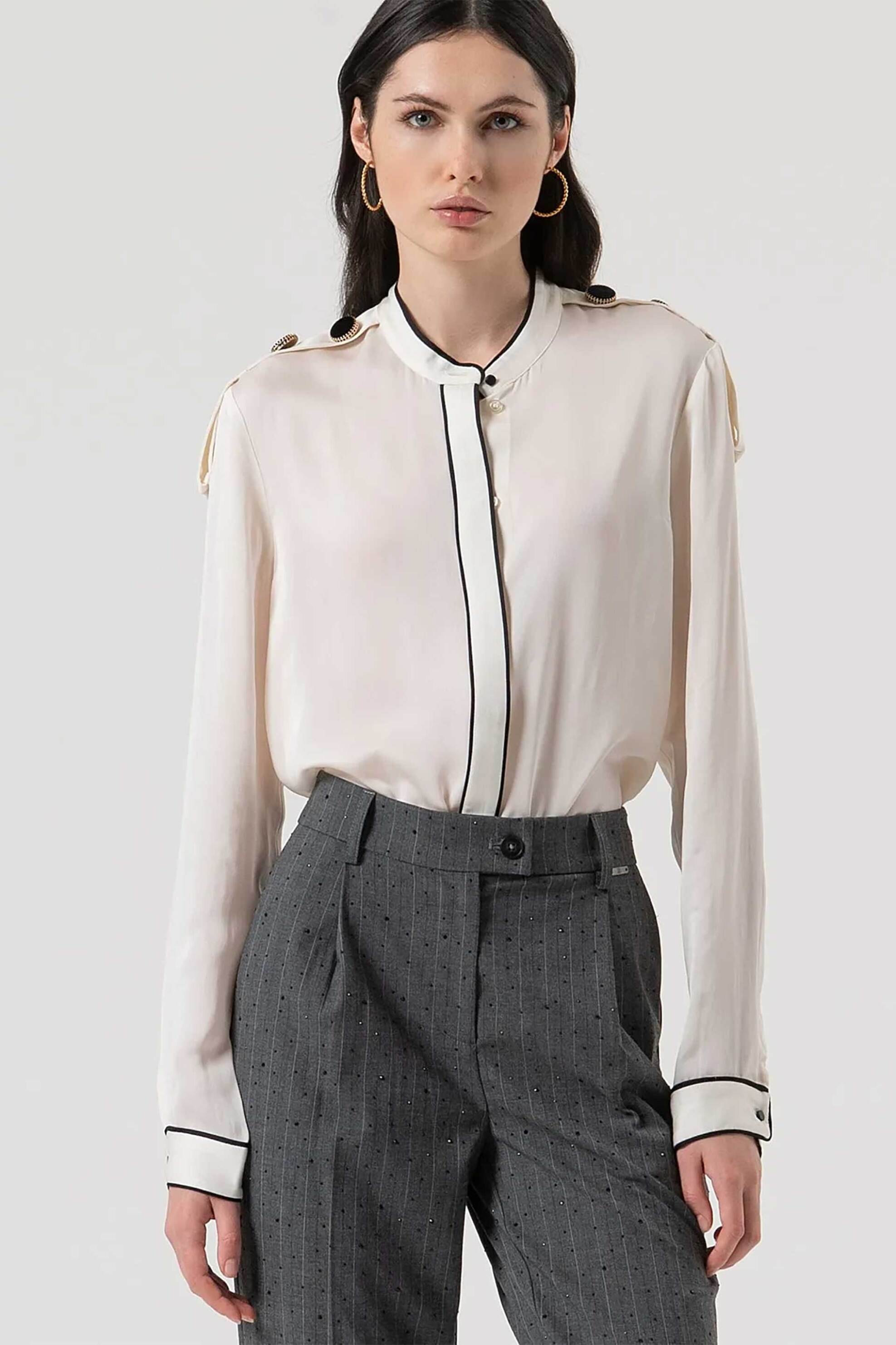 Γυναικείο πουκάμισο. Contrast λεπτομέρειες. Μao γιακάς. Μακρύ μανίκι. Regular fit. Προέλευση: CN. 52% βισκόζη, 48% μετάξι Το μοντέλο έχει ύψος 175 cm και φοράει νούμερο S. PFCMNA SPA