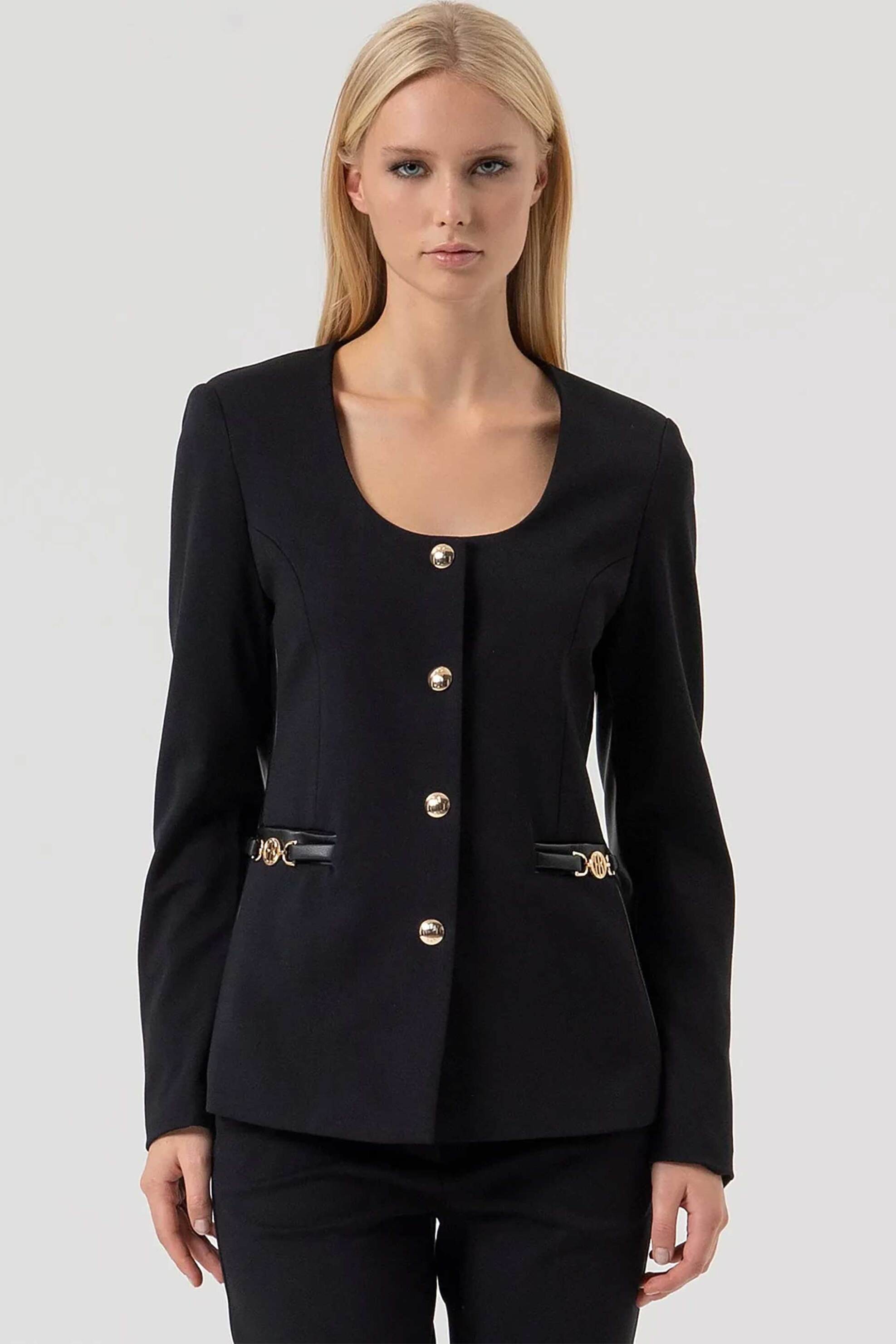 Γυναικείο σακάκι. Μονόχρωμο. Στρογγυλή λαιμόκοψη. Μακρύ μανίκι με faux δέρμα. Διακοσμητικές τσέπες με χρυσή αγκράφα. Κλείσιμο με κουμπιά. Slim fit. Προέλευση: CN. 100% polyester Το μοντέλο έχει ύψος 175 cm και φοράει νούμερο S. PFCMNA SPA