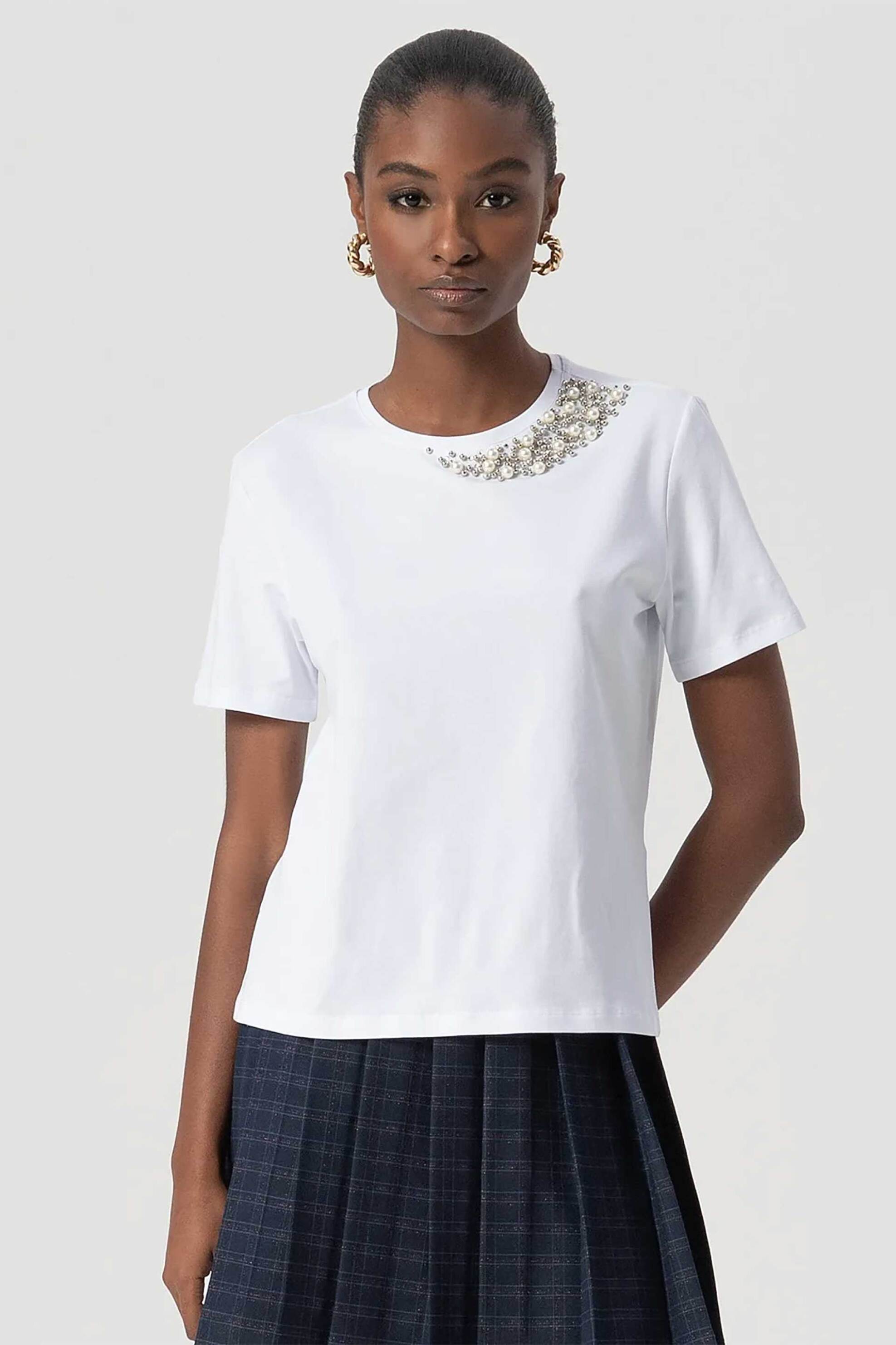 Γυναικείο T-shirt. Μονόχρωμo. Στρογγυλή λαιμόκοψη. Σχέδιο απο στρας στο μπροστινό μέρος. Κοντό μανίκι. Regular fit. Προέλευση: ΙΤ. 95% βαμβάκι, 5% elastane Το μοντέλο έχει ύψος 175 cm και φοράει νούμερο S. PFCMNA SPA