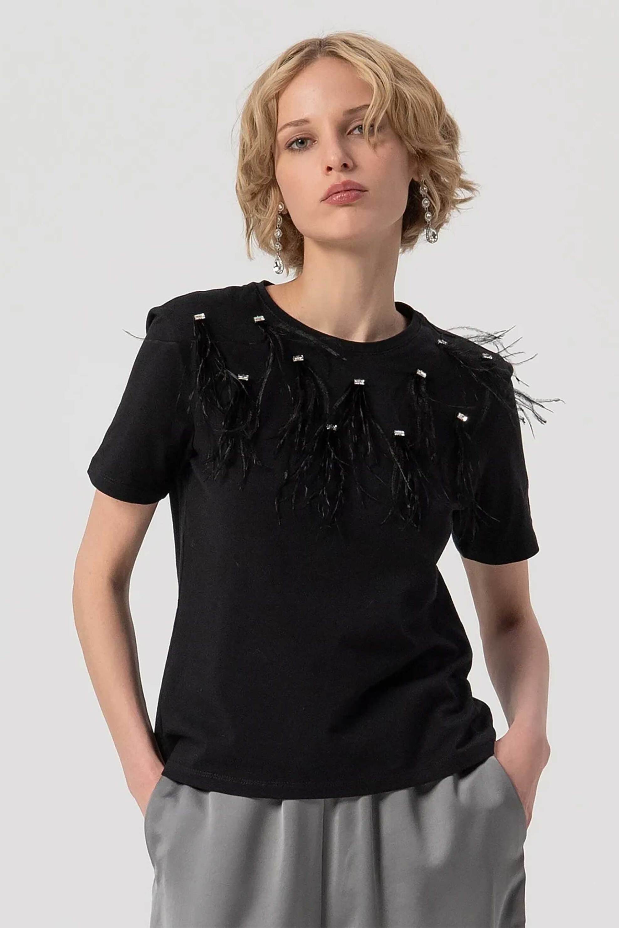 Γυναικείο T-shirt. Μονόχρωμo. Στρογγυλή λαιμόκοψη. Σχέδιο απο στρας και φτερά στο μπροστινό μέρος. Κοντό μανίκι. Regular fit. Προέλευση: ΙΤ. 95% βαμβάκι, 5% elastane Το μοντέλο έχει ύψος 175 cm και φοράει νούμερο S. PFCMNA SPA