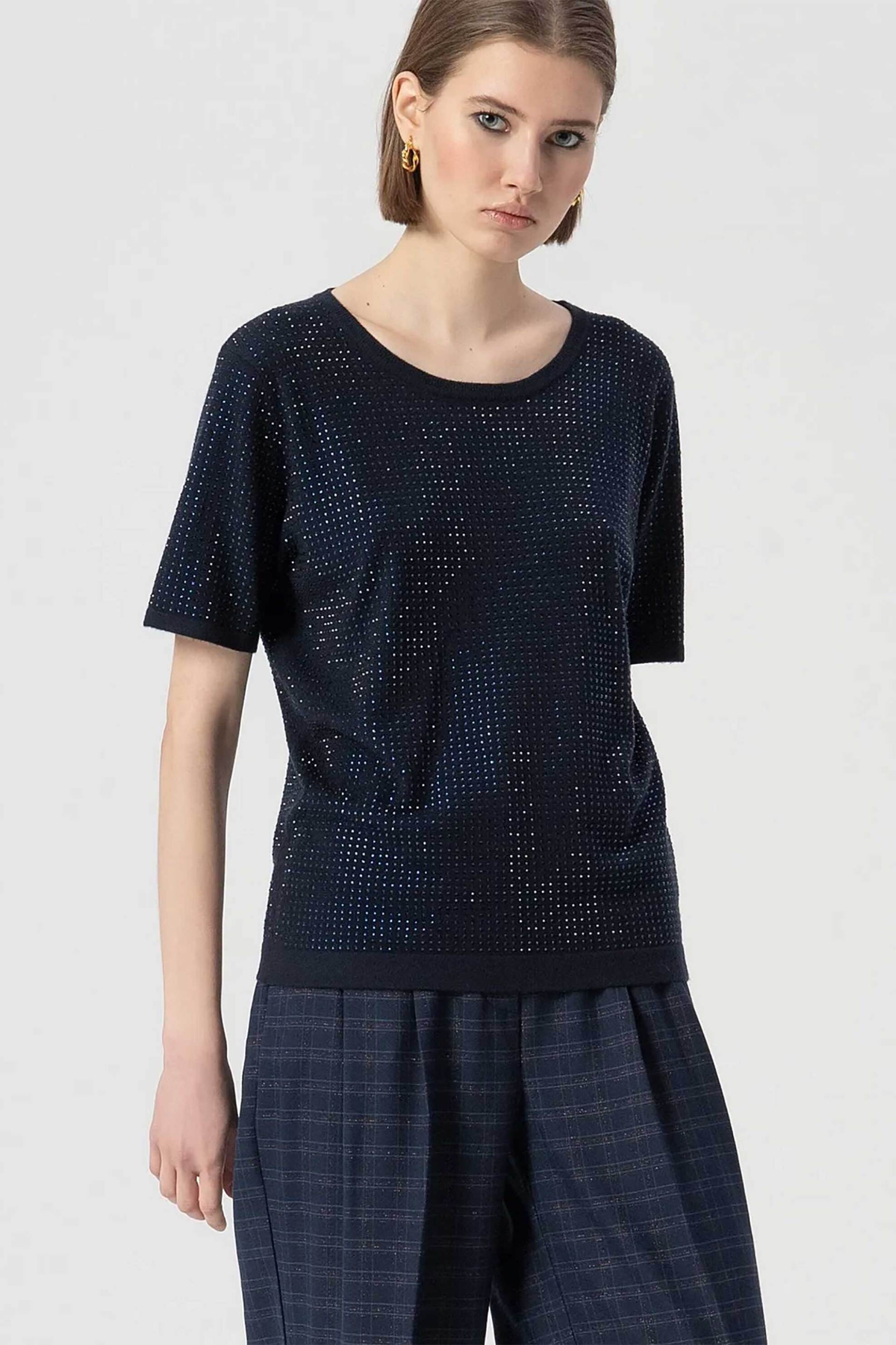 Γυναικείο T-shirt. Μονόχρωμo. Στρογγυλή λαιμόκοψη. All-over στρας. Κοντό μανίκι. Regular fit. Προέλευση: CN. 50% βισκόζη, 28% polyester, 22% nylon Το μοντέλο έχει ύψος 175 cm και φοράει νούμερο S. PFCMNA SPA