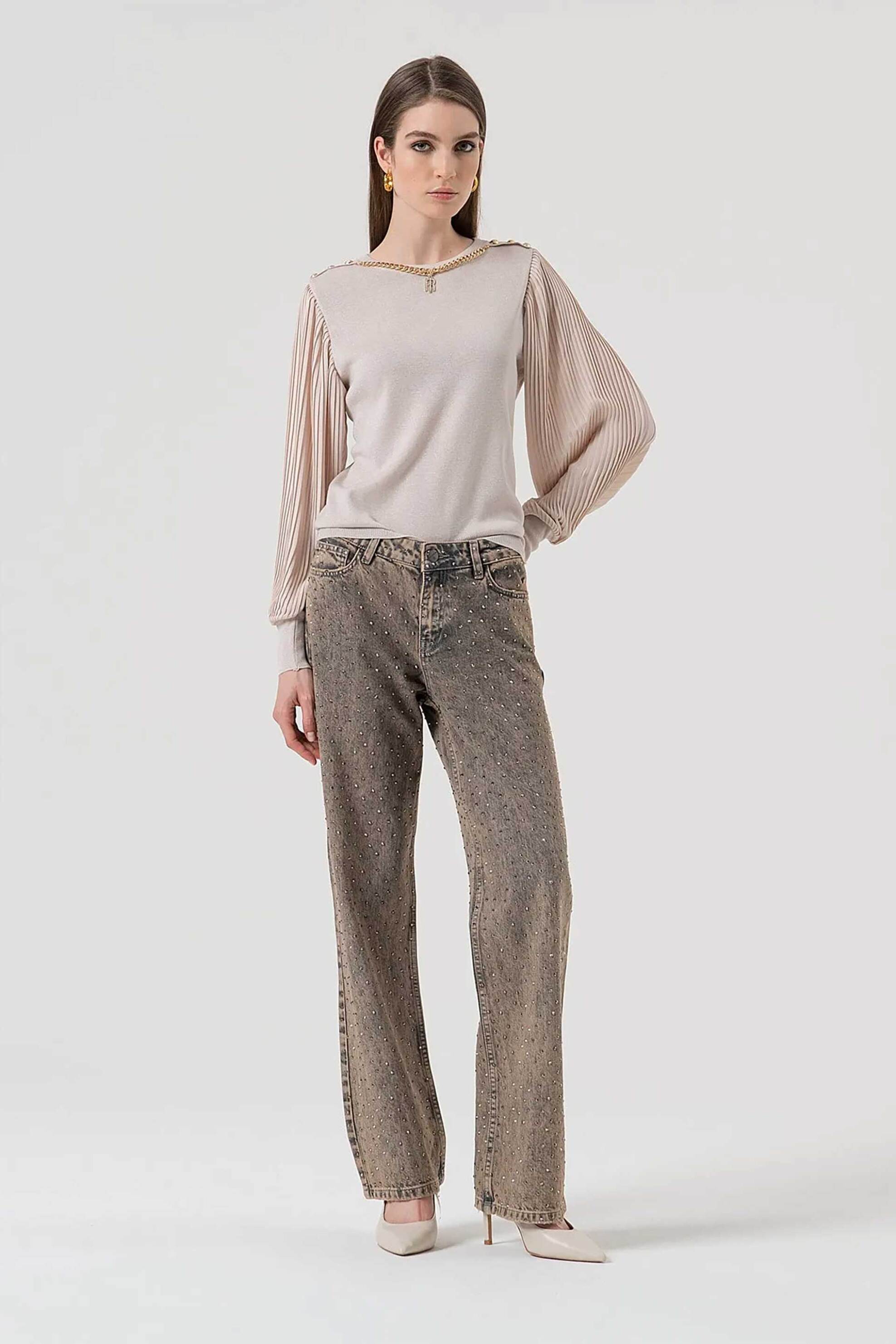 Γυναικείο τζιν παντελόνι. Flare. Στρας. Πεντάτσεπο. Κλείσιμο με φερμουάρ και κουμπί. Logo lebel. Προέλευση: TR. 100% βαμβάκι Το μοντέλο έχει ύψος 175 cm και φοράει νούμερο S. PFCMNA SPA