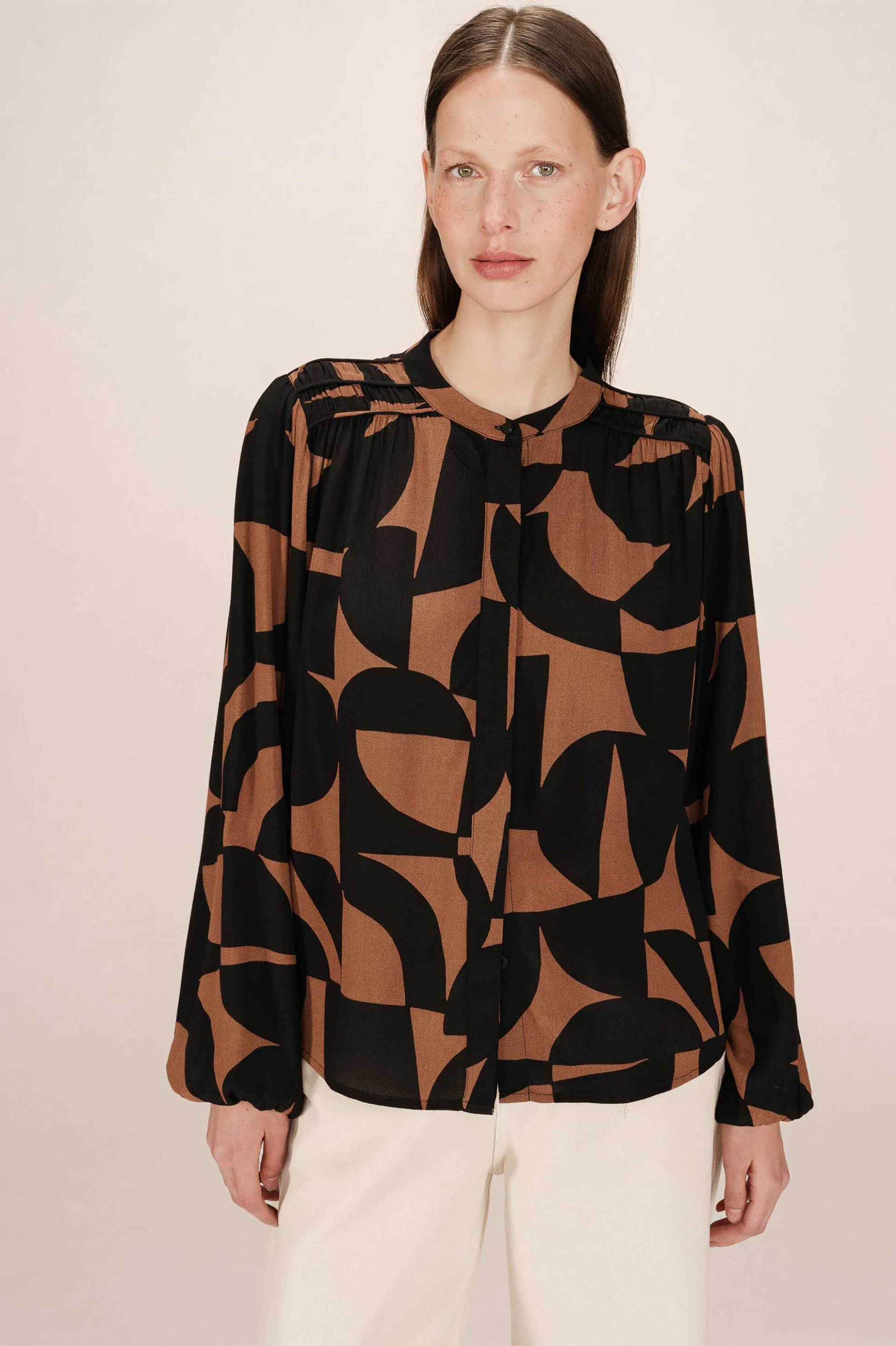 Γυναικεία μπλούζα. Στρογγυλή λαιμόκοψη. Μακρύ μανίκι balloon. Κλείσιμο με κουμπιά. Γεωμετρικό σχέδιο. Προέλευση: CN. 100% βισκόζη Το μοντέλο έχει ύψος περίπου 172 cm και φοράει μέγεθος S. ΑΙΣΑΚΟΣ Α.Ε.