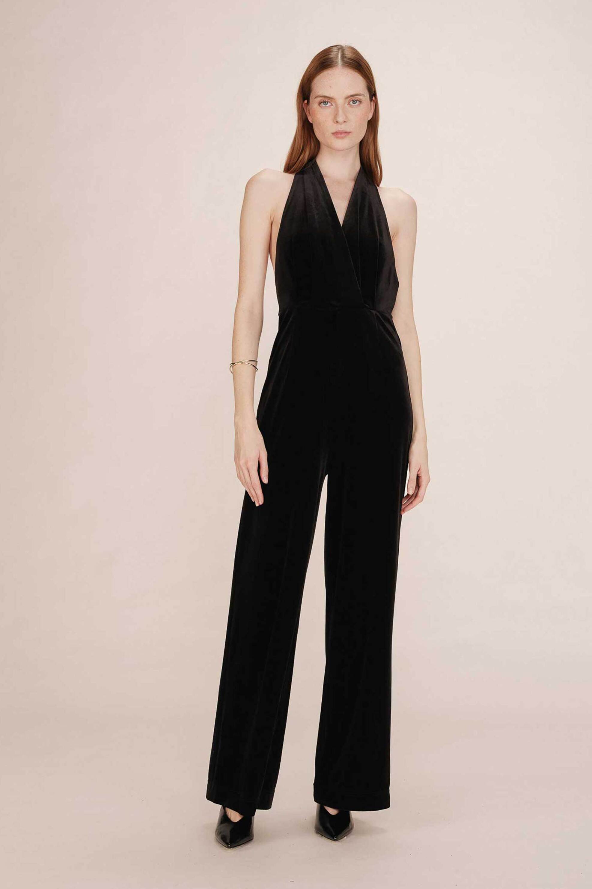 Γυναικεία ολόσωμη φόρμα. Velvet. V λαιμόκοψη. Δέσιμο στο πίσω μέρος της λαιμόκοψης. Ανοιχτή πλάτη. Κλείσιμο με φερμουάρ. Προέλευση: CN. 95% polyester, 5% elastane Το μοντέλο έχει ύψος περίπου 172 cm και φοράει μέγεθος S. ΑΙΣΑΚΟΣ Α.Ε.