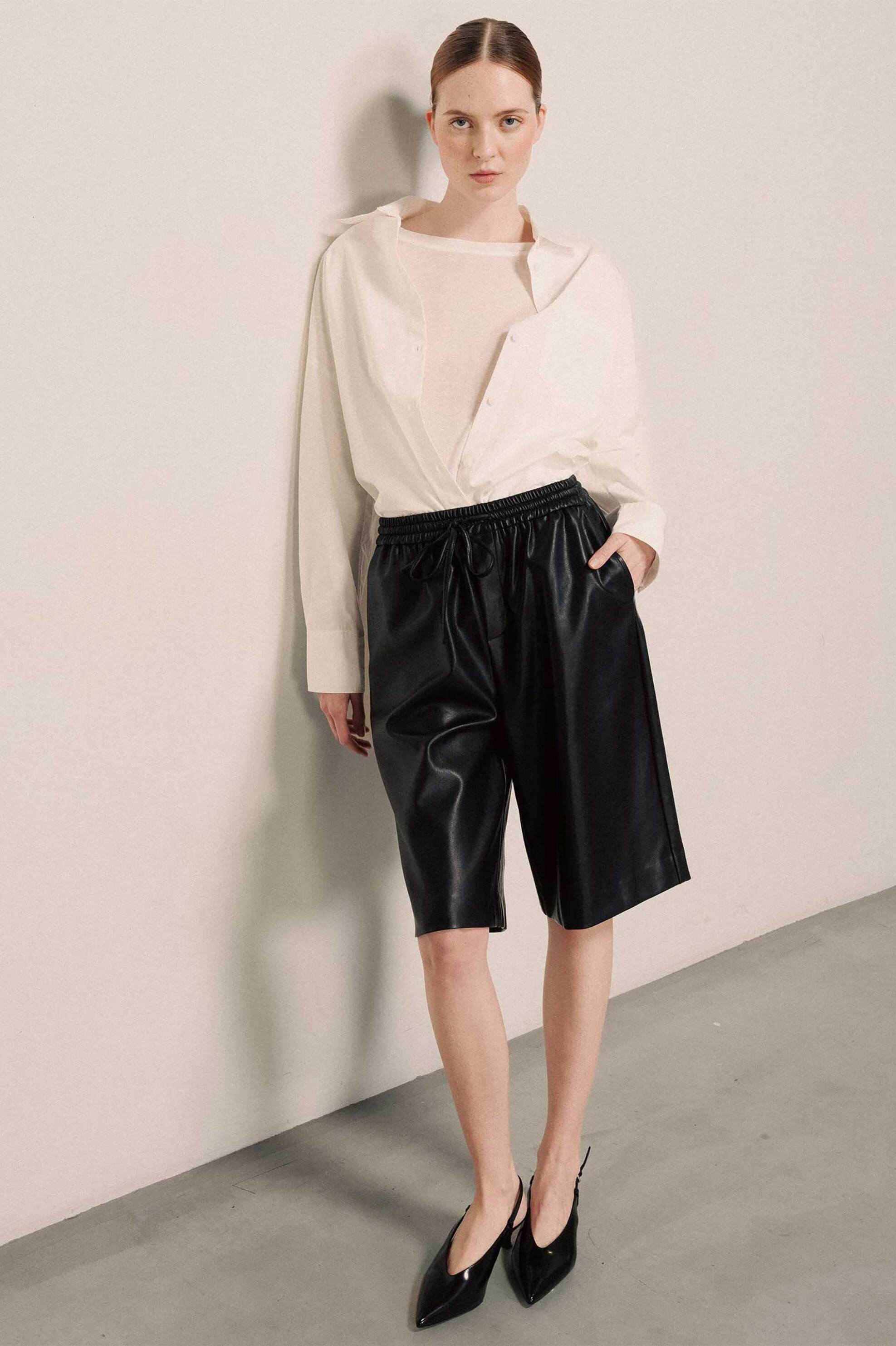 Γυναικεία βερμούδα. Faux δέρμα. Ελαστική μέση. Τσέπες στο πλάι. Straight cut. Προέλευση: CN. 45% polyurethane, 55% βισκόζη Το μοντέλο έχει ύψος περίπου 176 cm και φοράει μέγεθος S. ΑΙΣΑΚΟΣ Α.Ε.