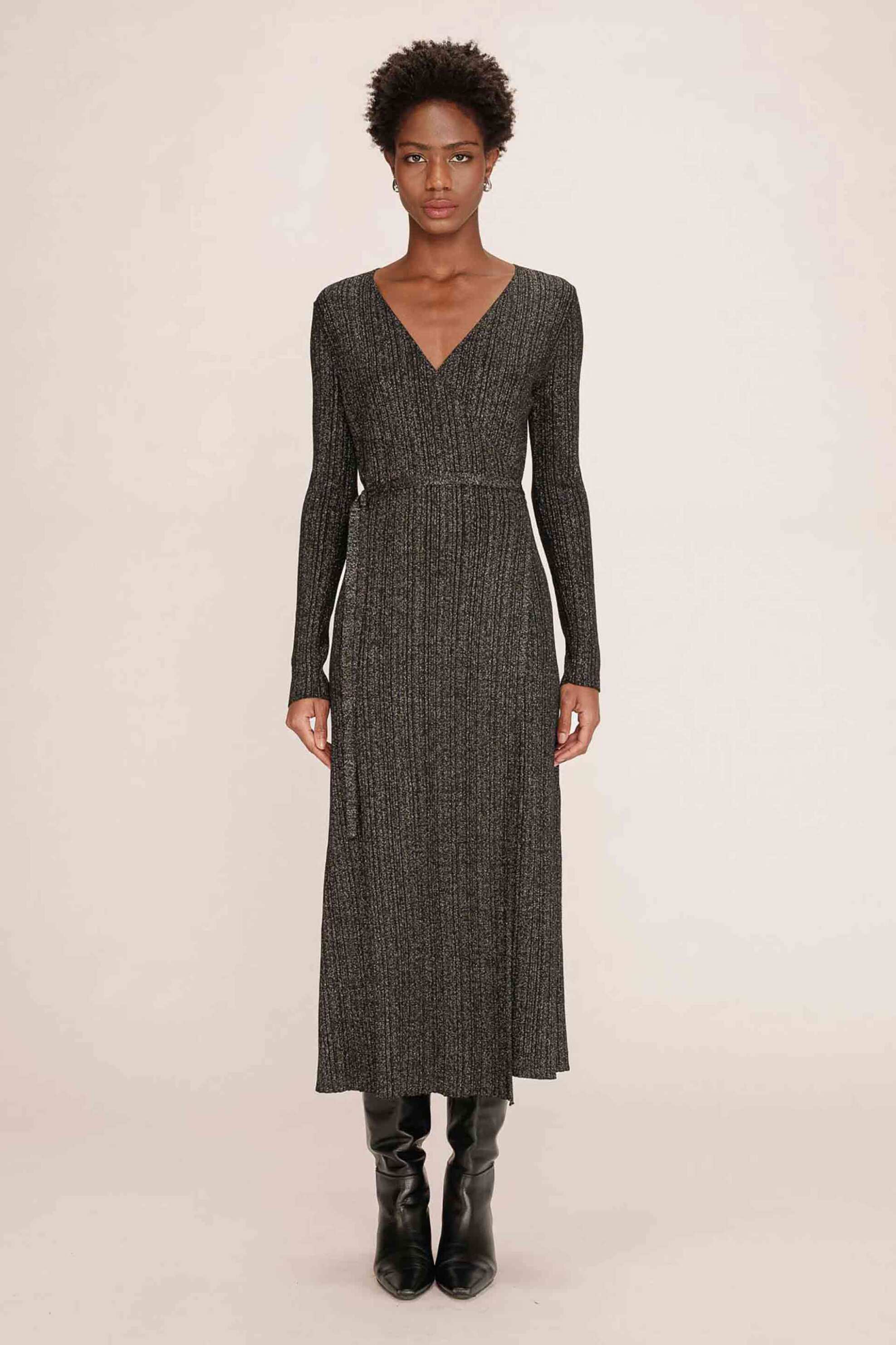 Γυναικείο φόρεμα lurex. Wrap κλείσιμο. V λαιμόκοψη. Μονόχρωμο. Μακρύ μανίκι. Προέλευση: CN. 52% recycled polyester, 30% βισκόζη, 18% metallic fiber Sustainable: προϊόν που έχει κατασκευαστεί με ίνες ανακυκλωμένου πλαστικού, μειώνοντας το περιβαλλοντικό αποτύπωμα. Το μοντέλο έχει ύψος 176 cm και φορ...