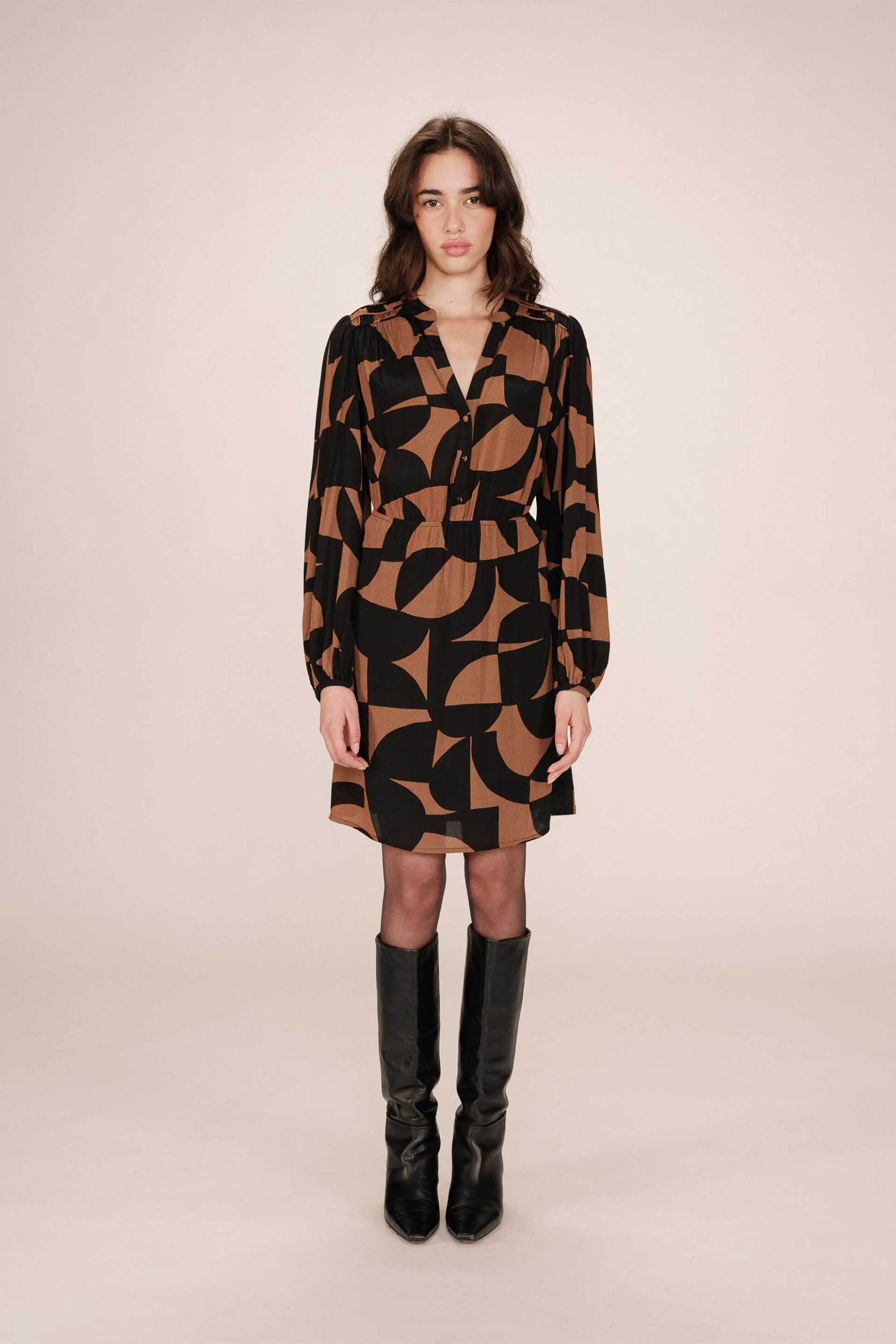 Γυναικείο mini φόρεμα. V λαιμόκοψη. Κλείσιμο με κουμπιά στο πάνω μέρος. Μακρύ μανίκι. Ελαστική μέση. Γεωμετρικό σχέδιο. Προέλευση: CN. 100% βισκόζη Το μοντέλο έχει ύψος περίπου 172 cm και φοράει μέγεθος S. ΑΙΣΑΚΟΣ Α.Ε.