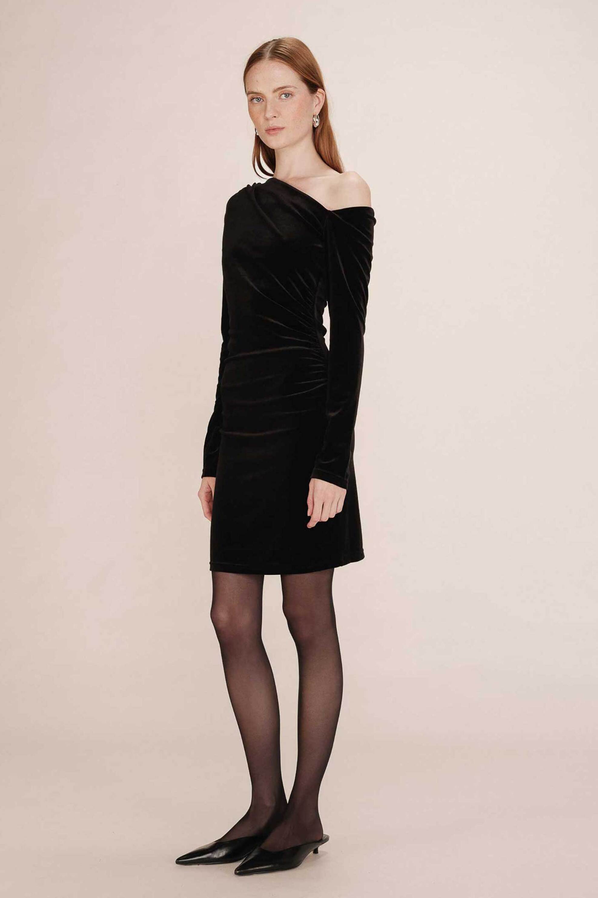 Γυναικείο mini φόρεμα. Velvet. Ασύμμετρο πάνω μέρος. Μακρύ μανίκι. Προέλευση: CN. 90% polyester, 10% elastane Το μοντέλο έχει ύψος περίπου 176 cm και φοράει μέγεθος S. ΑΙΣΑΚΟΣ Α.Ε.
